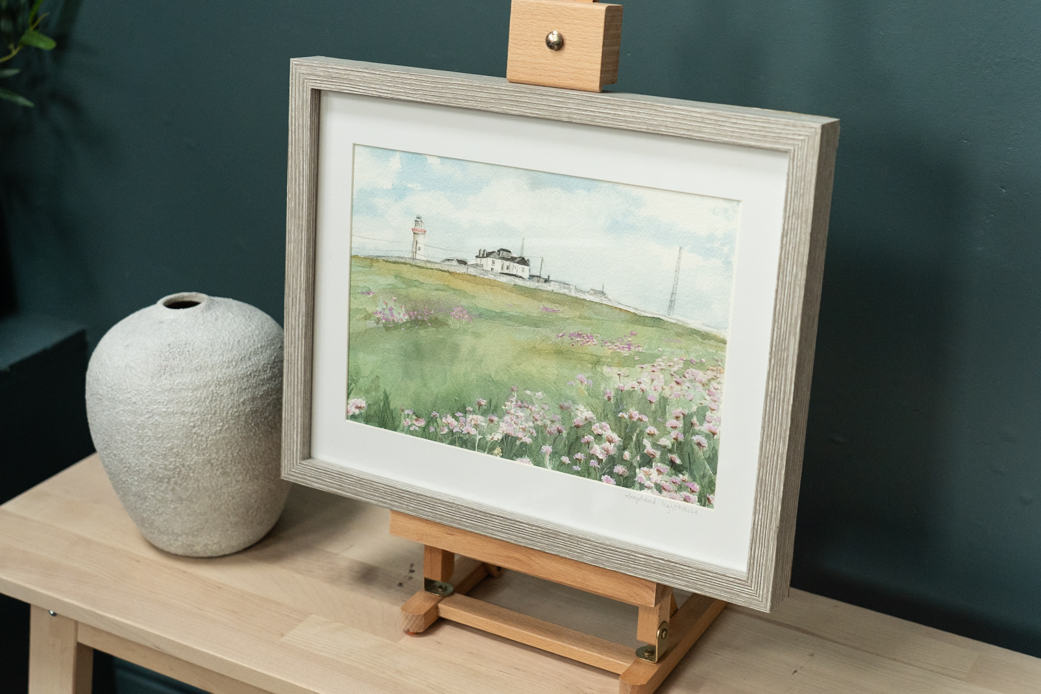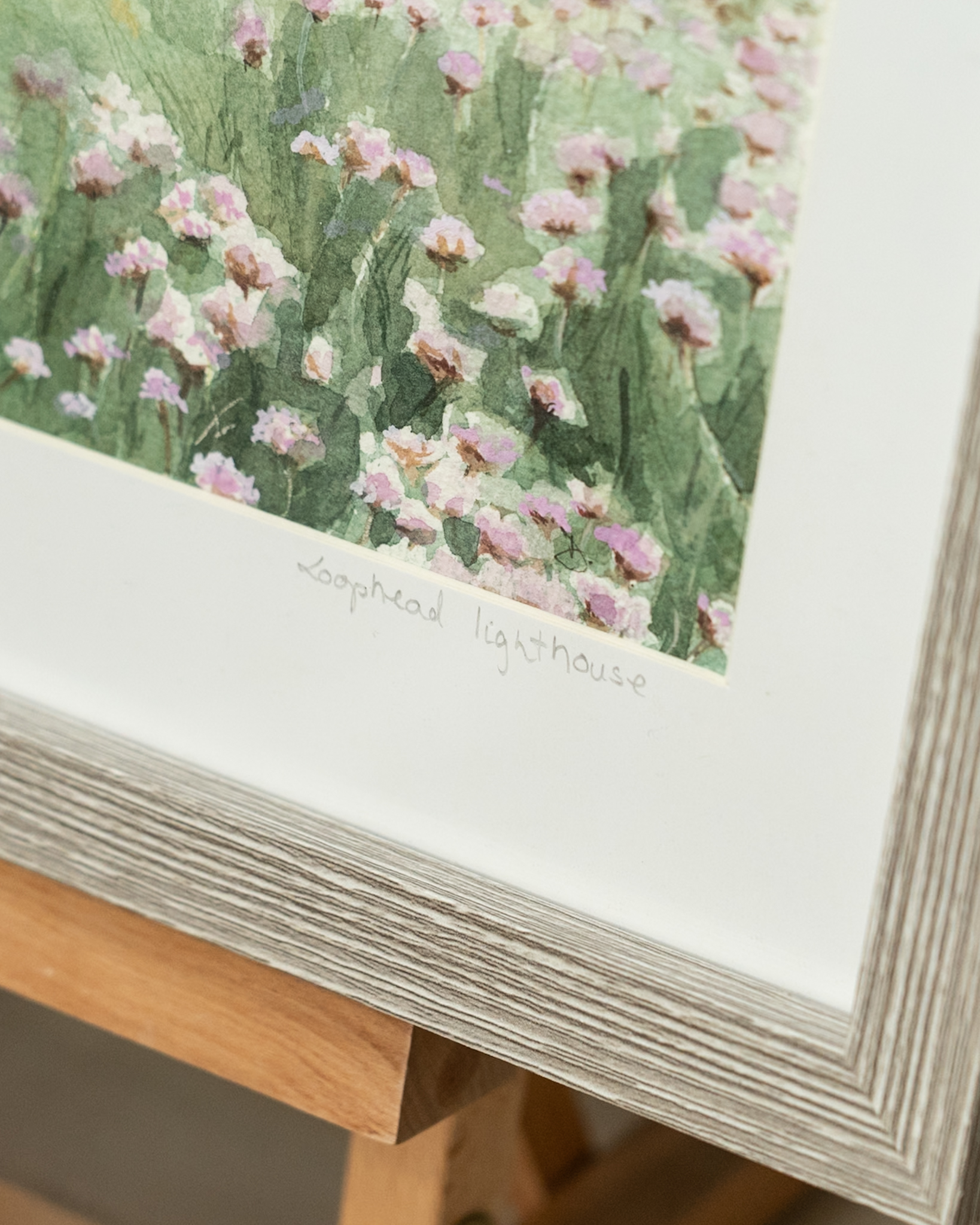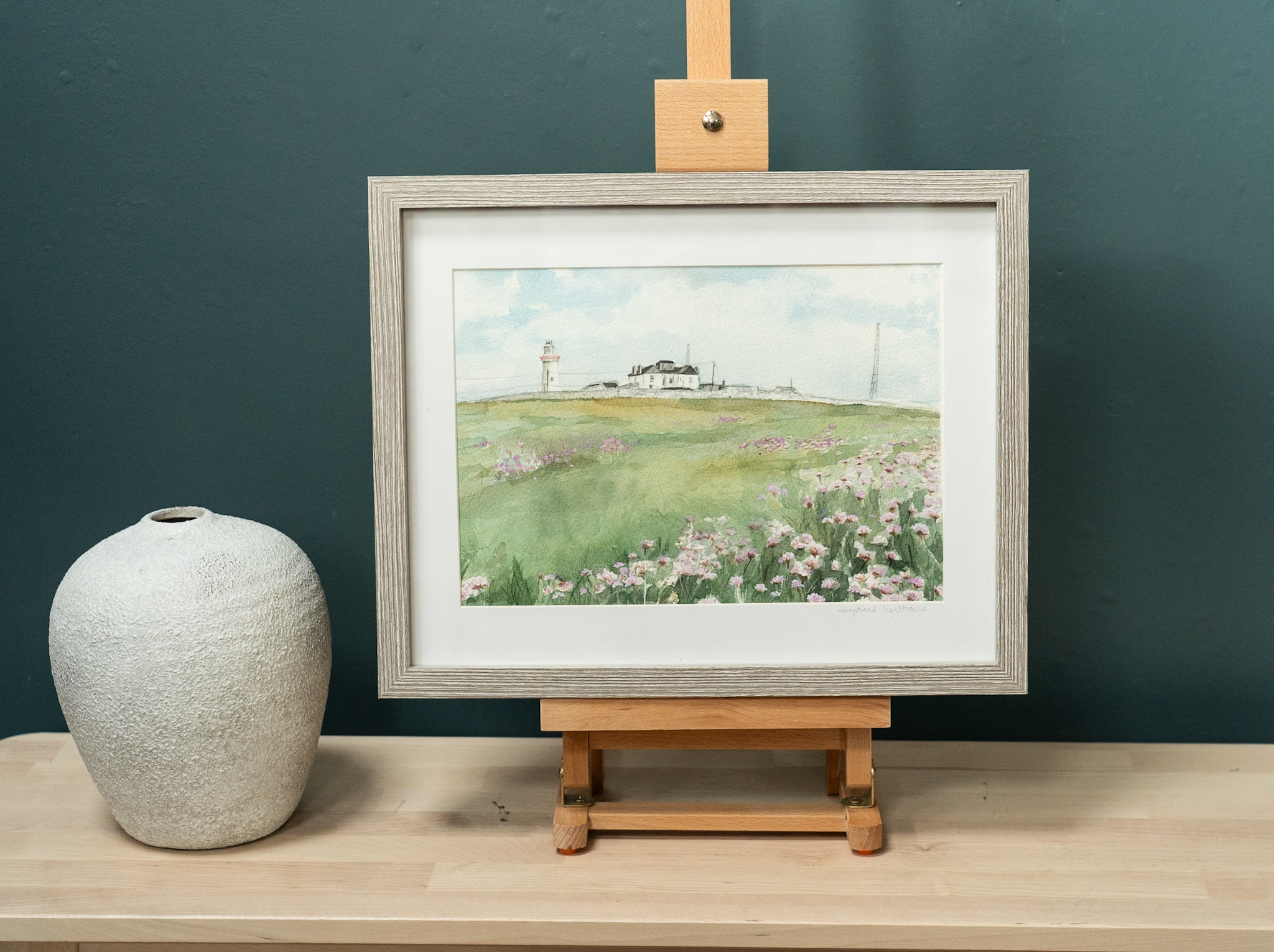 Very sweet, original watercolour by the artist ‘D’. The beautiful and historic Loop Head Lighthouse building in the distance; the foreground, a carpet of bouncy heather, sprinkled with the most gorgeous sea pinks.