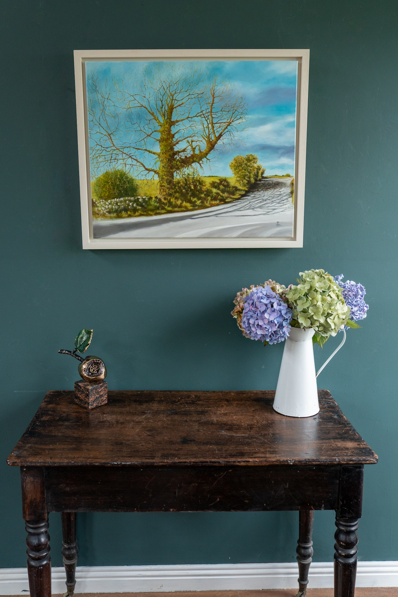 As Spring gradually unfolds, the inevitable ‘stretch in the evening’ starts to become more evident. This is such a gorgeously striking oil painting by artist, Mary Roberts. The high sun casting shadows onto the road below, the beautiful and promising blue skies, the bare branches of the winter worn trees, now reaching hopefully north for warmth. Evocative and sweet, this painting is rather fabulously uplifting.