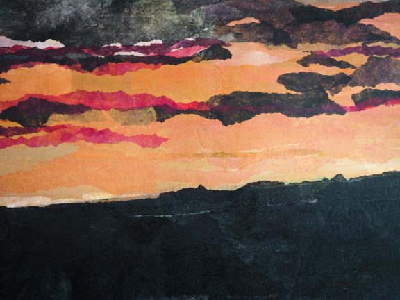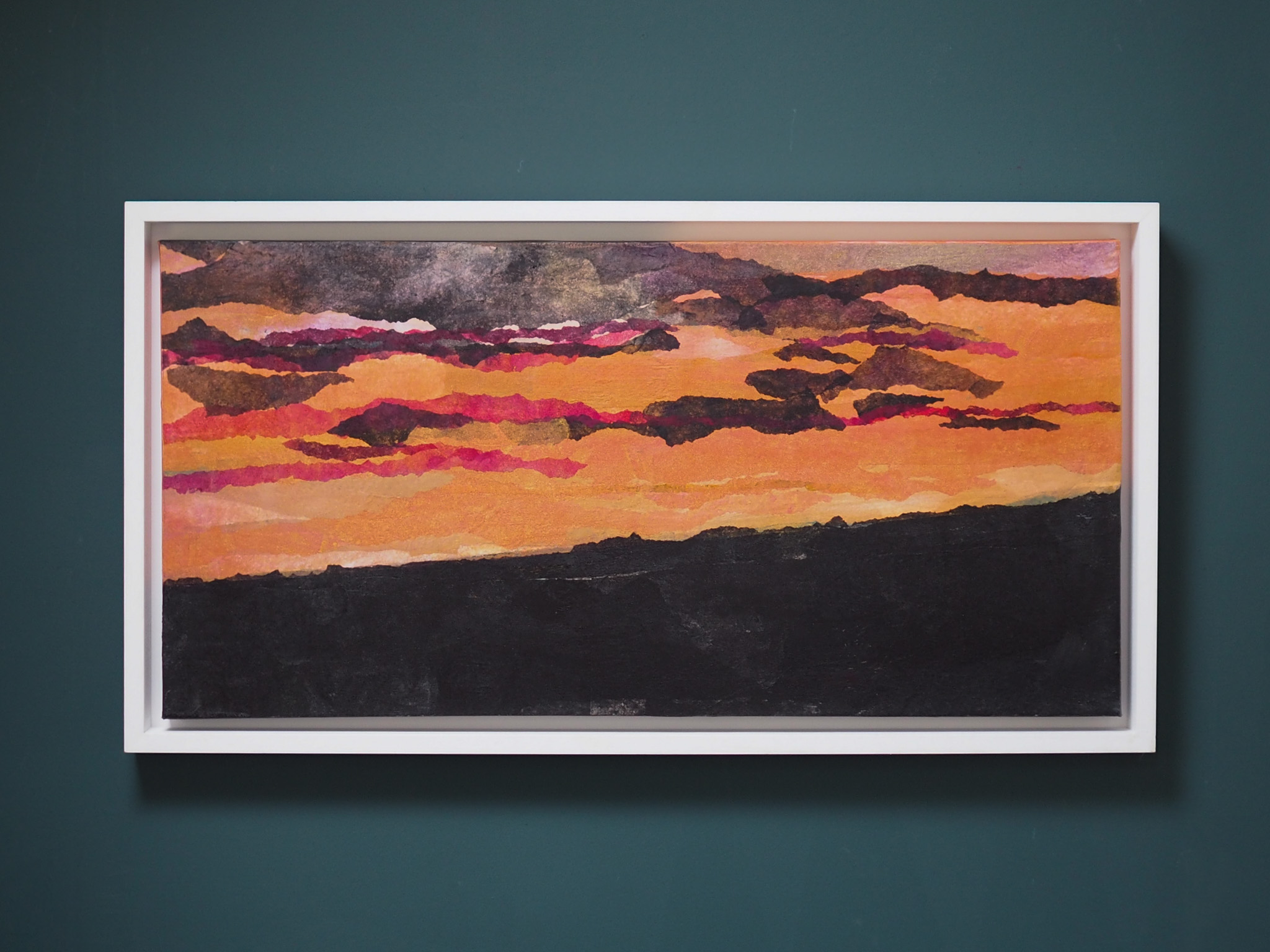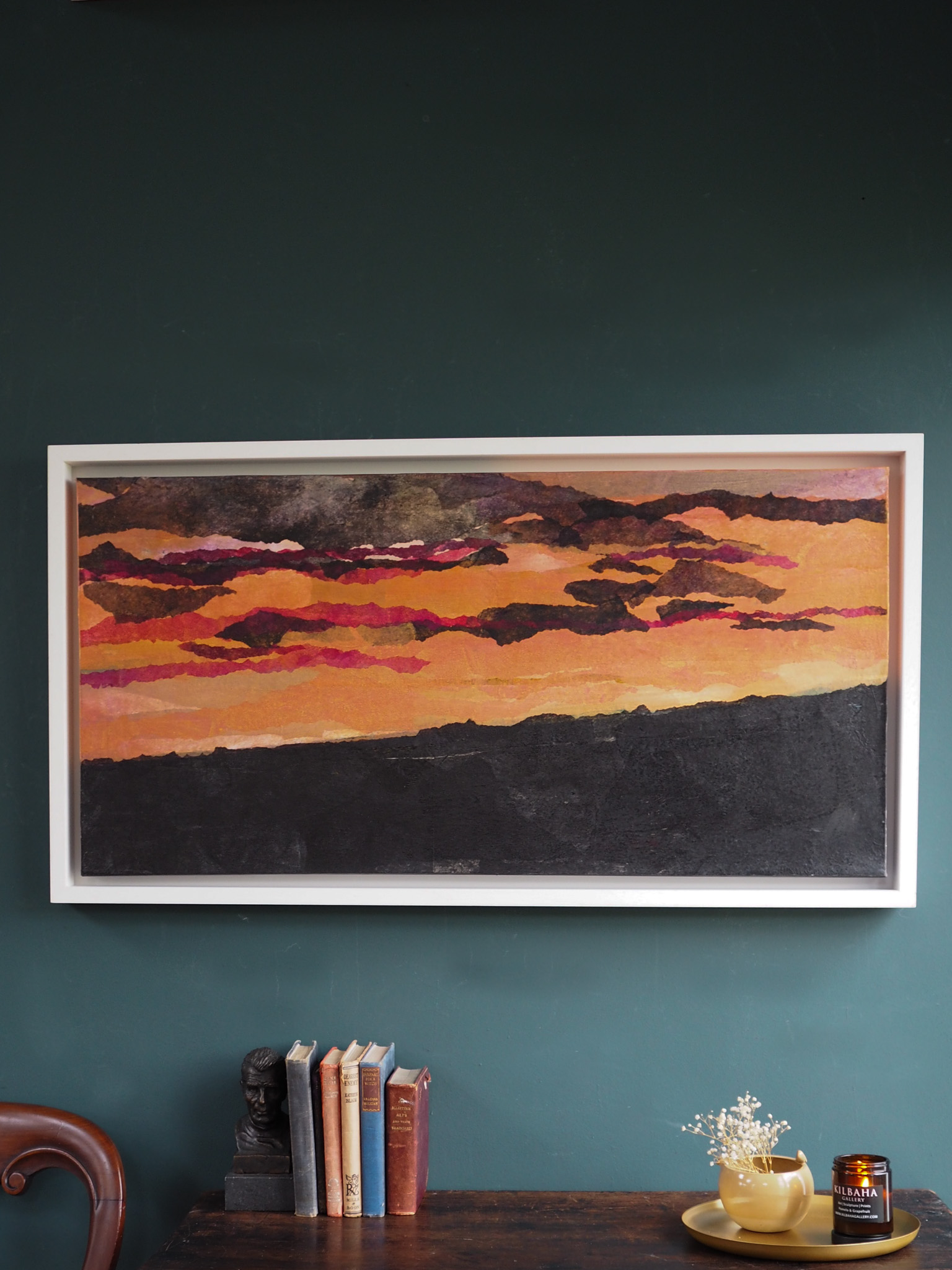A super strong piece of original art. Moody evening skies, rolling and gathering over the land, at the end of the day. The nod to a two story farmhouse, tucked cosily into the landscape, the sea in the distance.