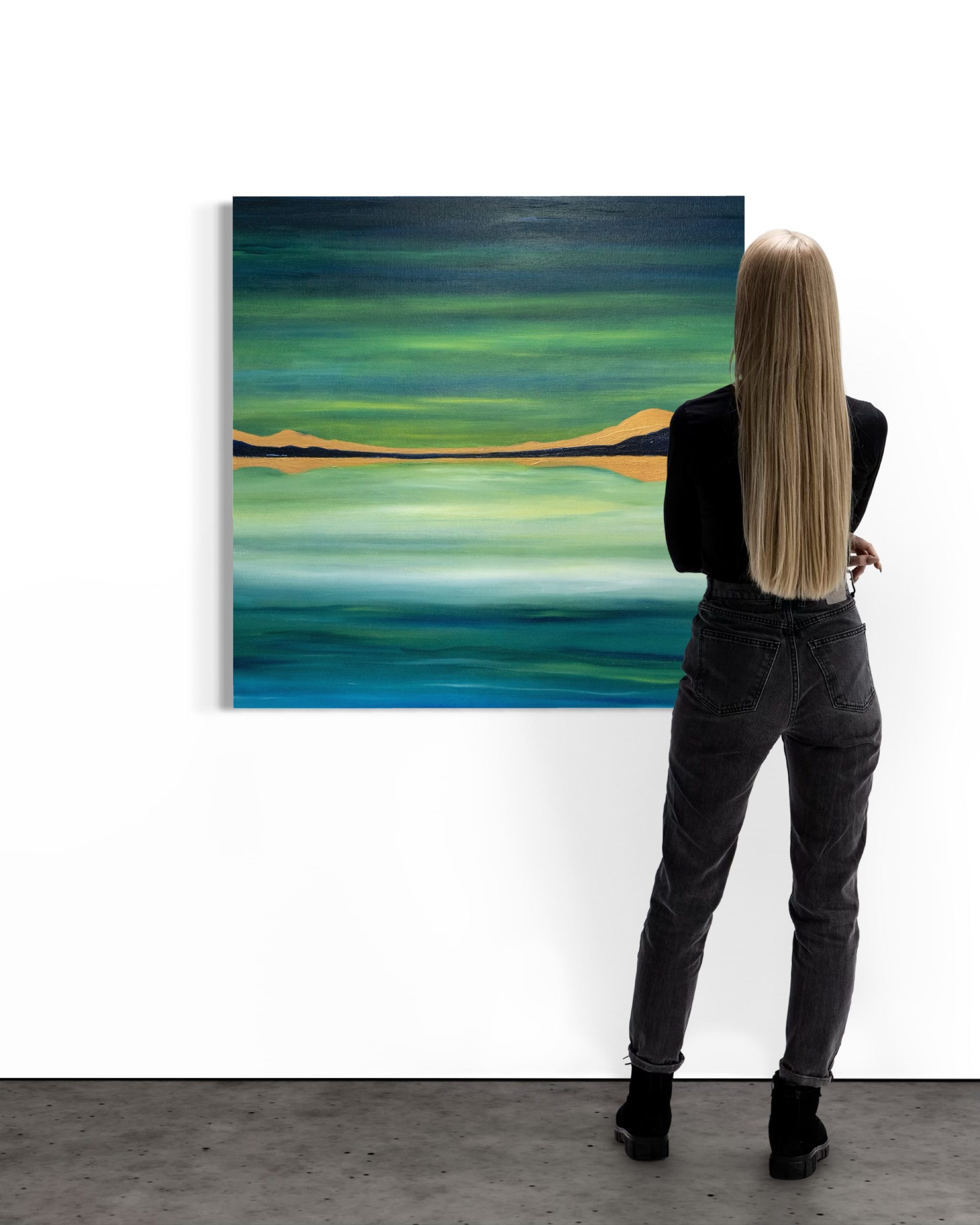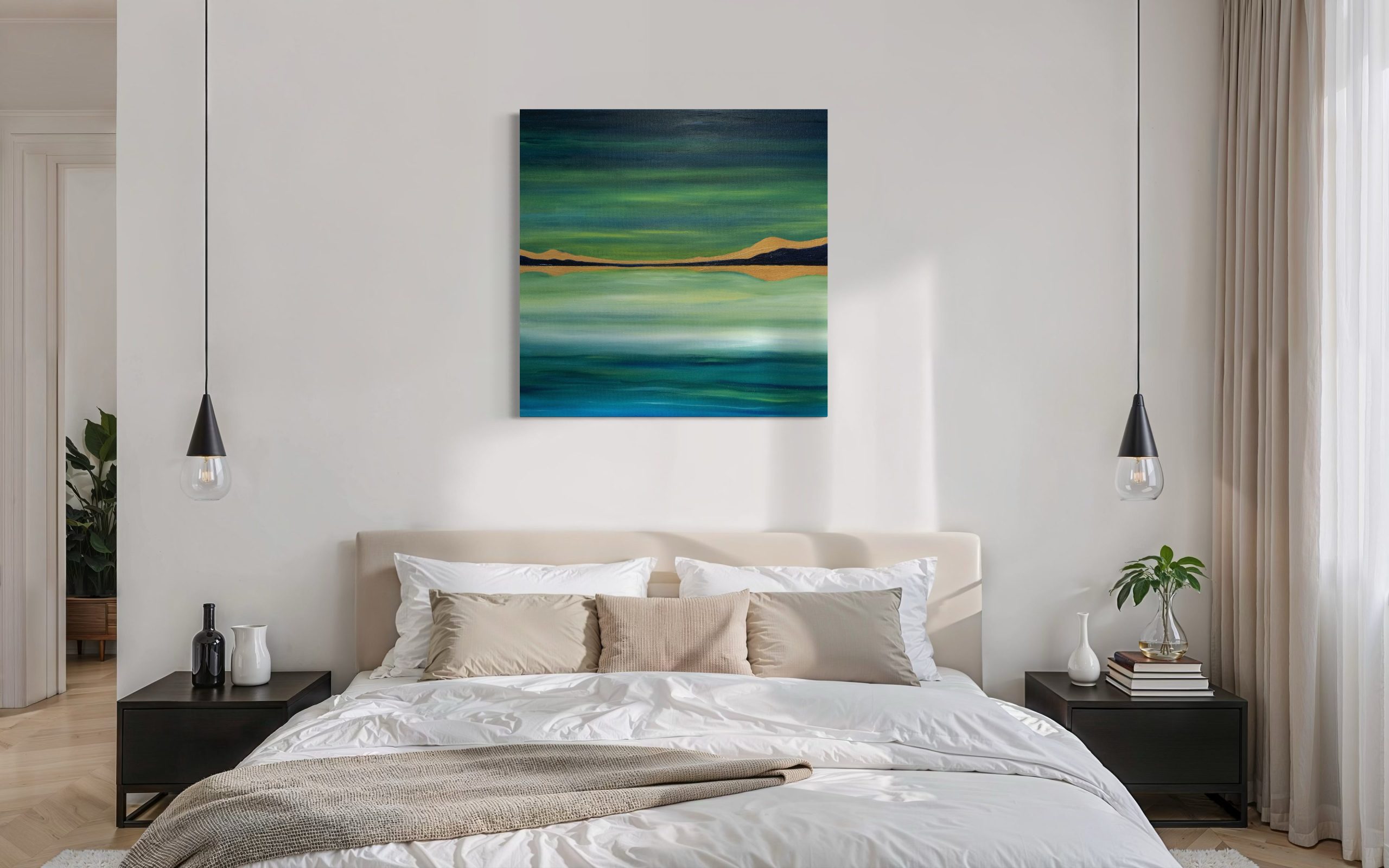 A beautiful, large scale oil on canvas painting, by contemporary artist Paul McMahon, which is the artists impression of a coastline under an aurora borealis sky.