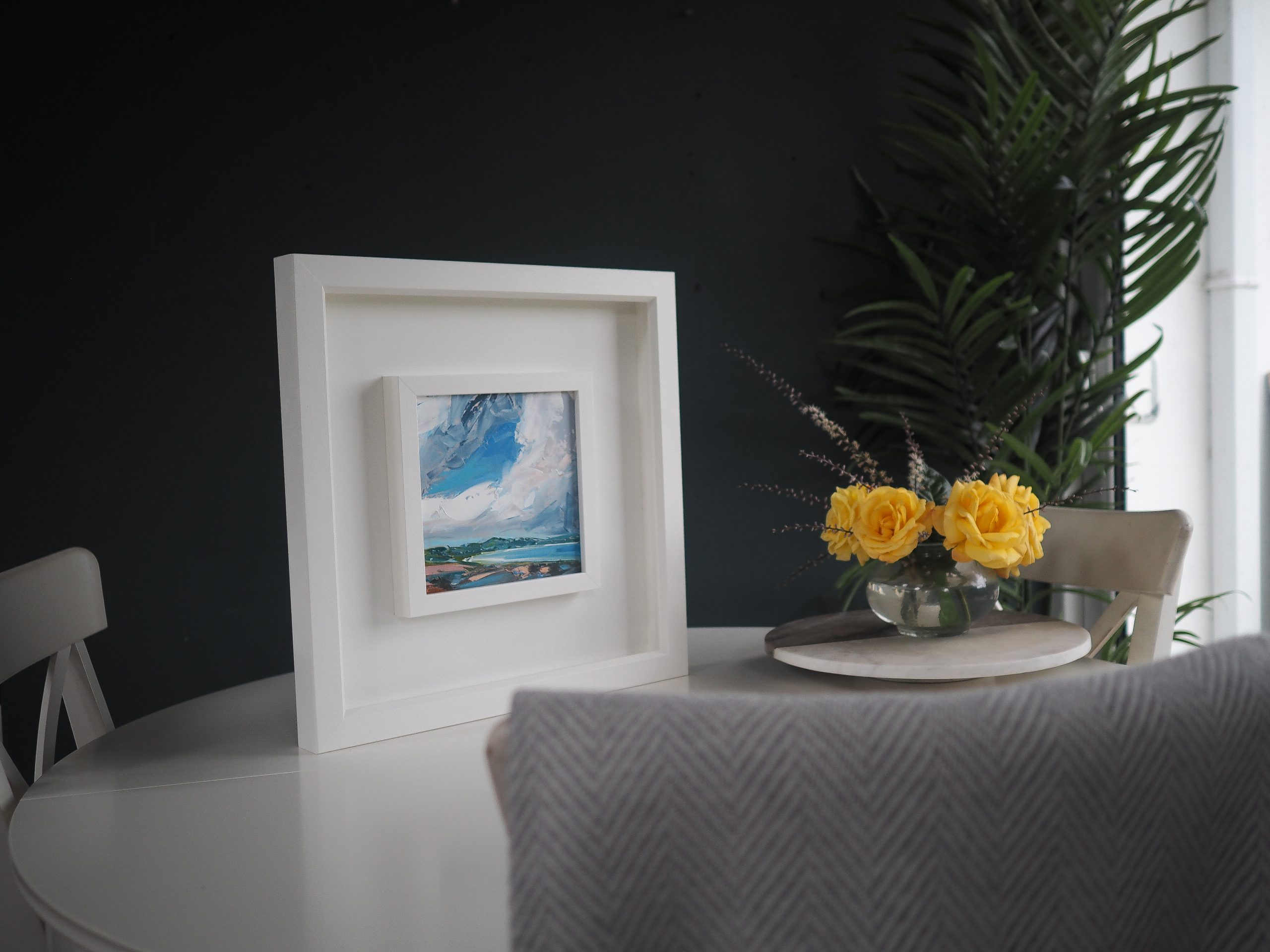 A beautiful summers day, where despite some big clouds over head, the sun manages to break through. Gorgeously depicted in oils by David Coyne, this small original oil painting, highlights the harbour and bay basking beneath the large summer sky. A superb opportunity to nab an original David Coyne piece.