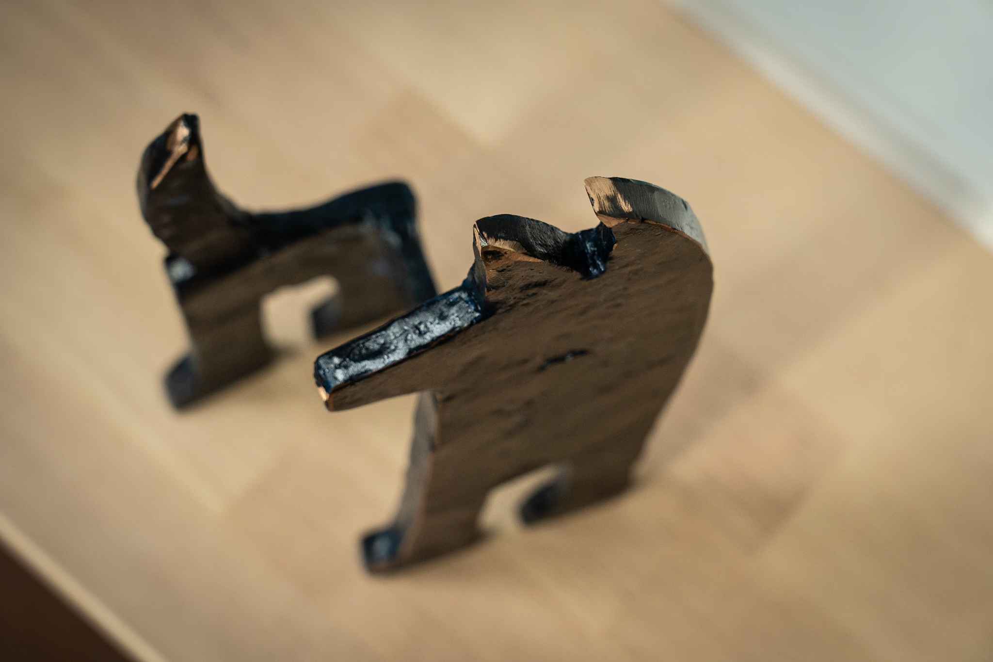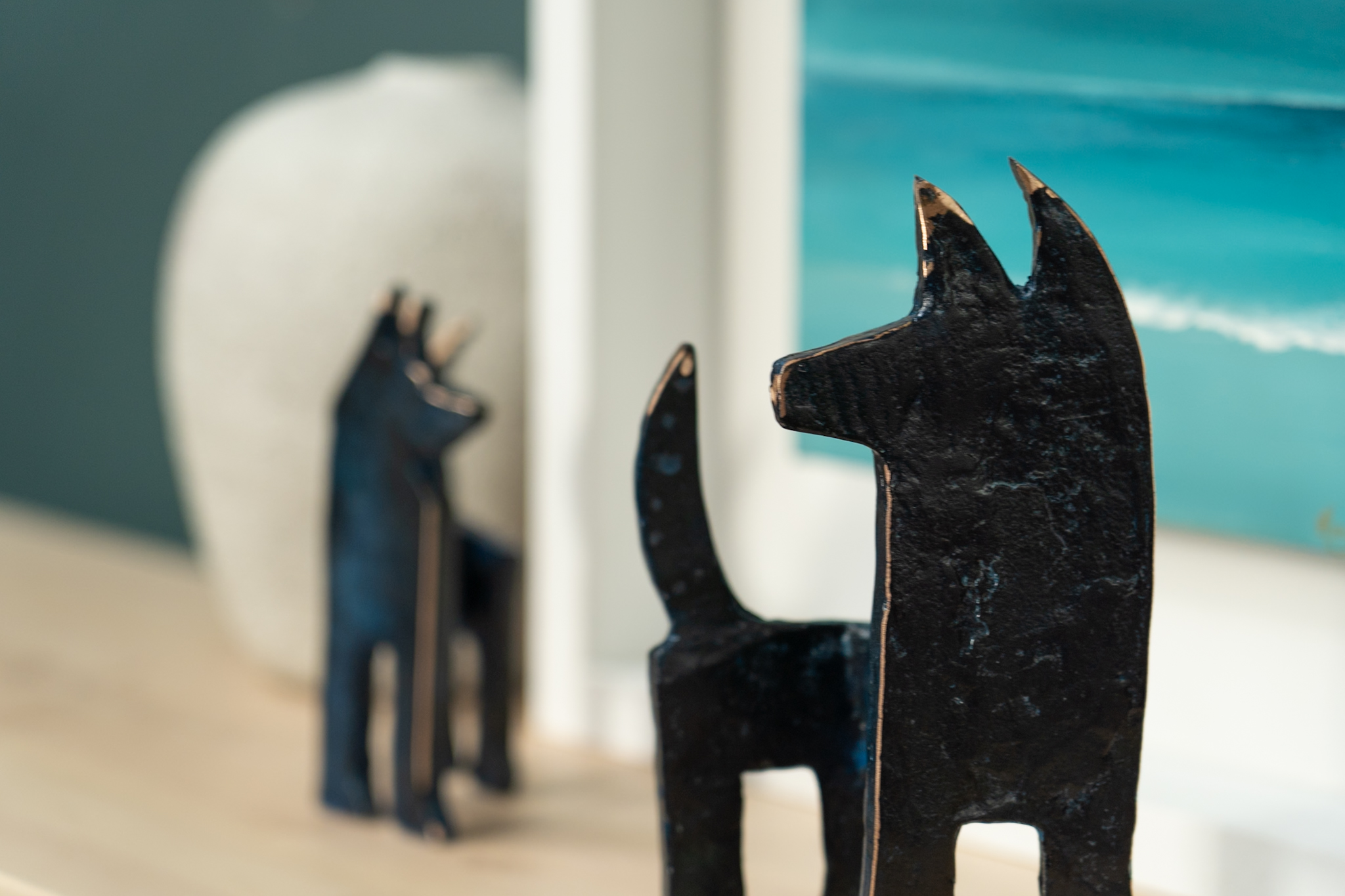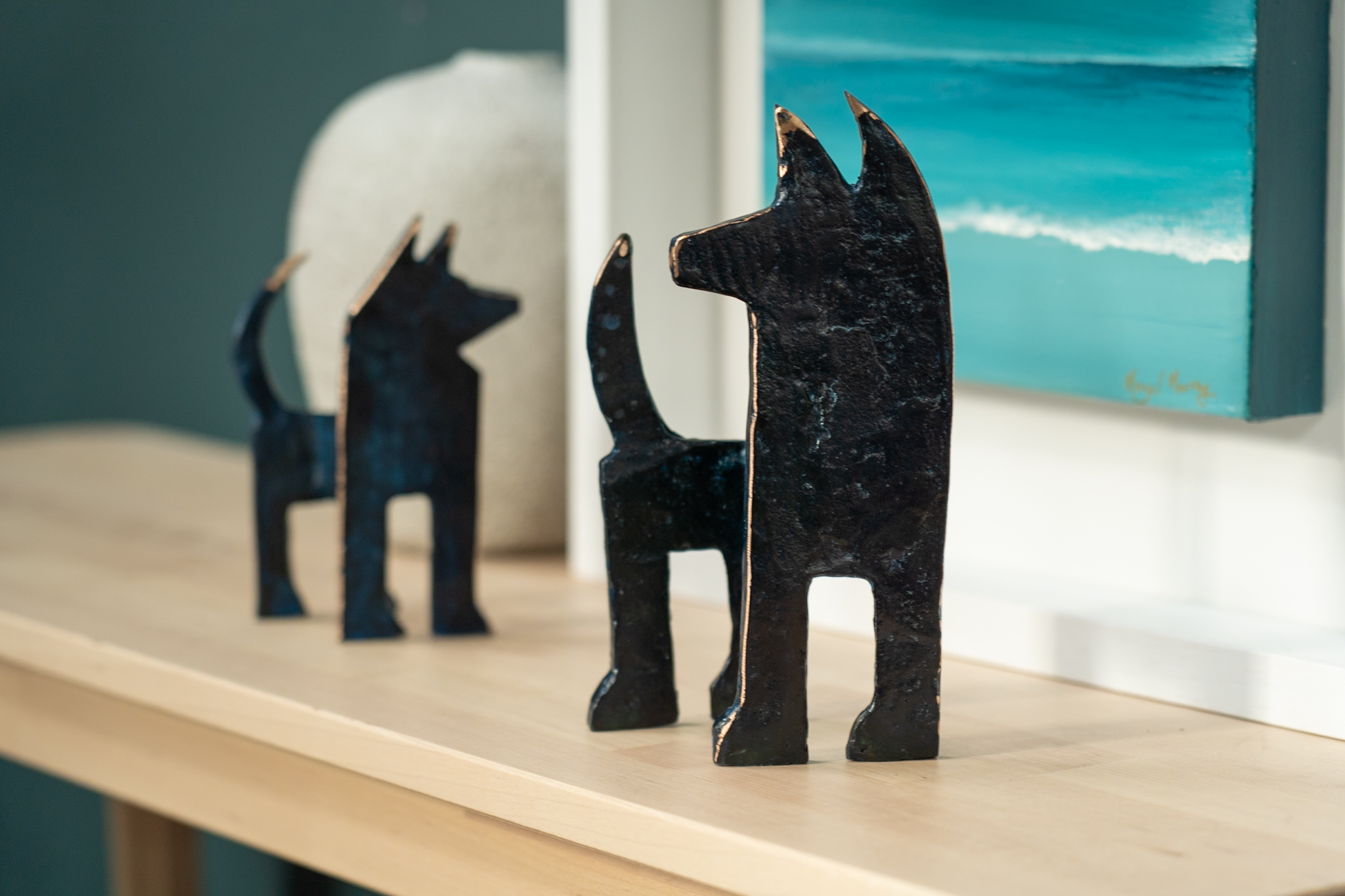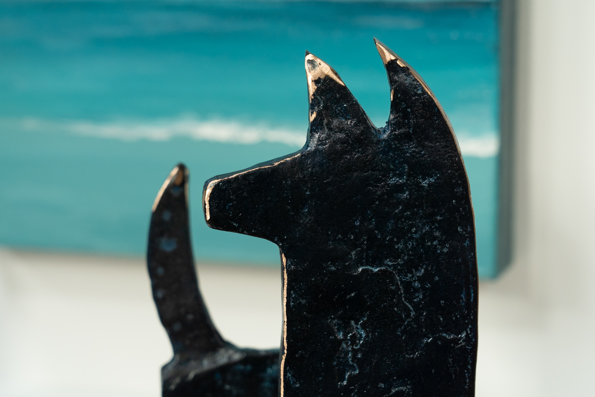 Seamus is one of Ireland’s leading portrait sculptors. When not busy with commemorative life-size commissions, Seamus loves to focus on his stylized animal sculptures. One of his signature styles is turning these two dimensional sculptural elements into what becomes an adorable three dimensional piece, full of personality and charm. Part of his series of dog sculptures, this is a beautiful wee fellow – varying depths of dark green in colour with layered patina in a matte finish that allows for some interesting flecks of the lighter and darker hues beneath to peak through as well as some gorgeous polished bronze edging for that extra touch of glamour!