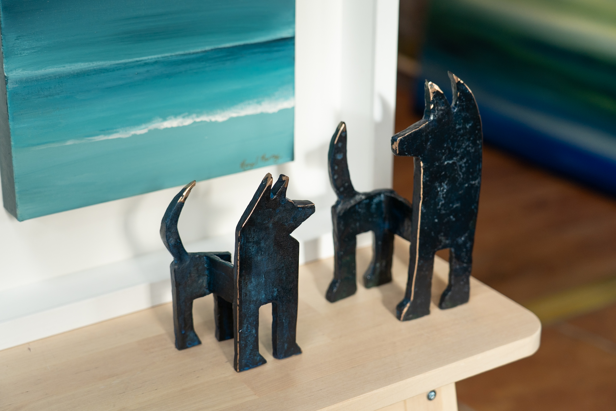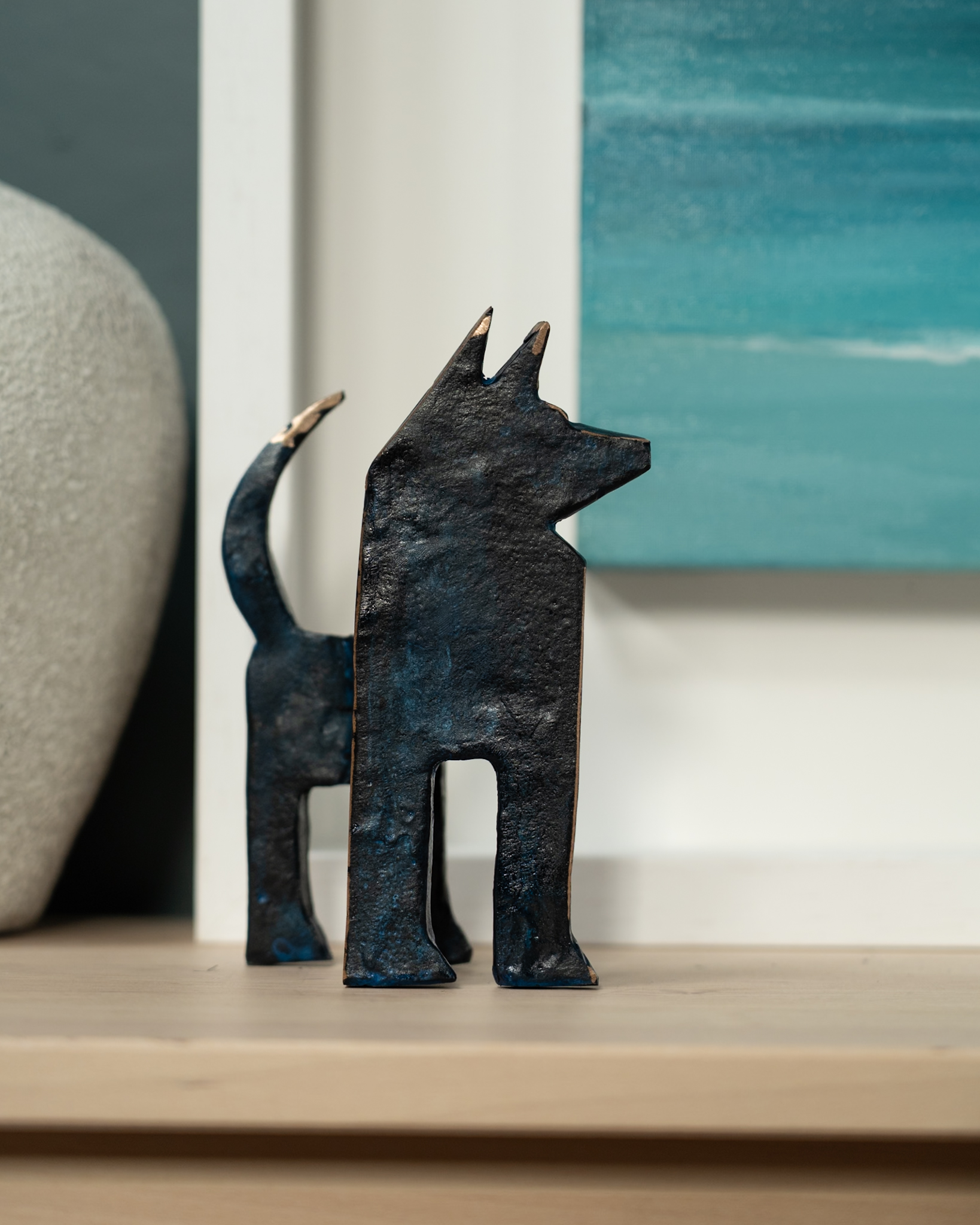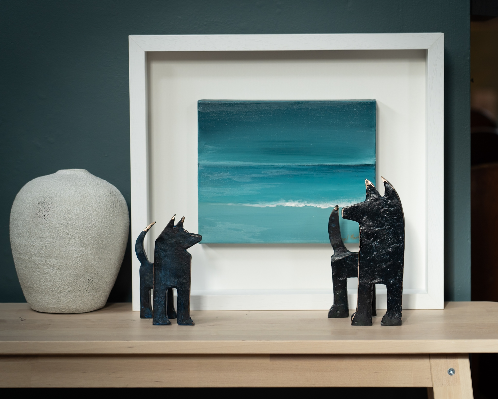 Seamus is one of Ireland’s leading portrait sculptors. When not busy with commemorative life-size commissions, Seamus loves to focus on his stylized animal sculptures. One of his signature styles is turning these two dimensional sculptural elements into what becomes an adorable three dimensional piece, full of personality and charm. Part of his series of dog sculptures, this is a beautiful wee fellow – varying depths of dark green in colour with layered patina in a matte finish that allows for some interesting flecks of the lighter and darker hues beneath to peak through as well as some gorgeous polished bronze edging for that extra touch of glamour!