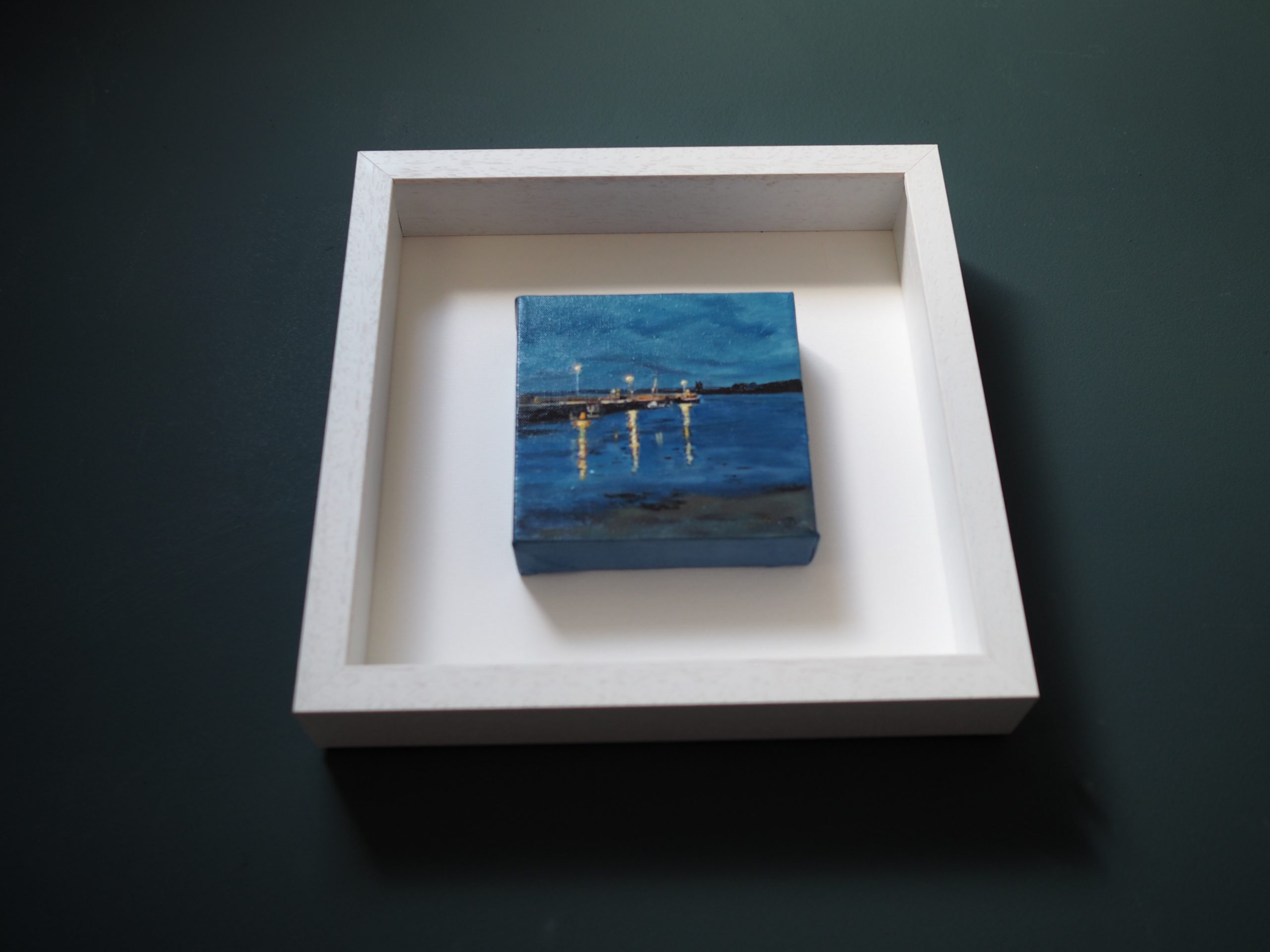 ‘Carrigaholt Pier’ – a beautiful miniature oil on canvas by the exciting West Clare artist signing their work only as ‘D’. The gorgeous deep blue’s of a late evening sky and sea; with the gorgeous reflections of the streetlights flickering onto the waters below. This is a gorgeous original piece with an important local connection – such a super collectable little painting to own!