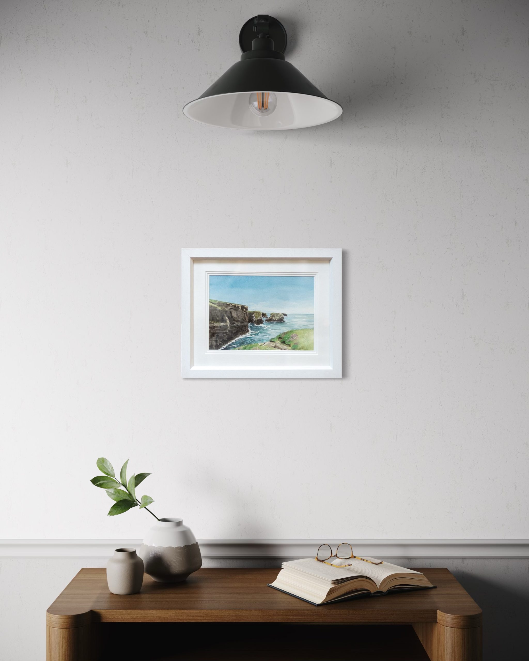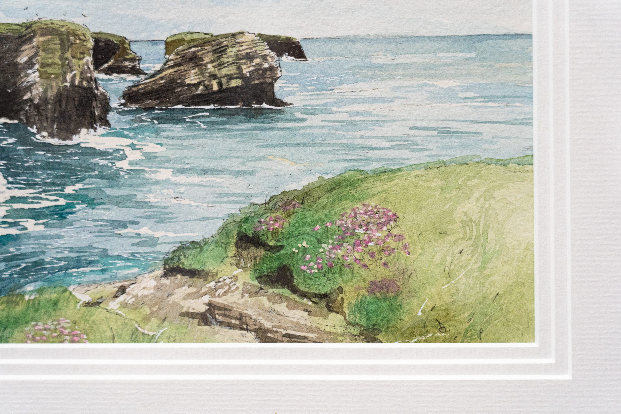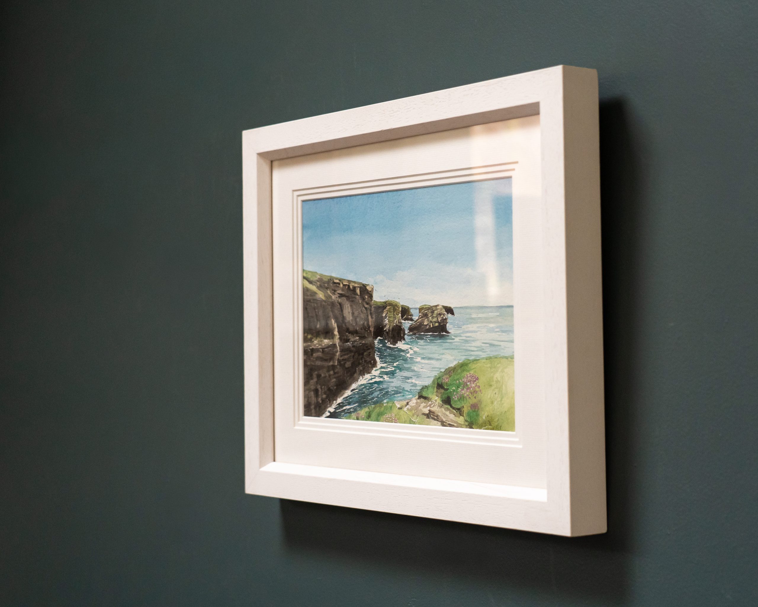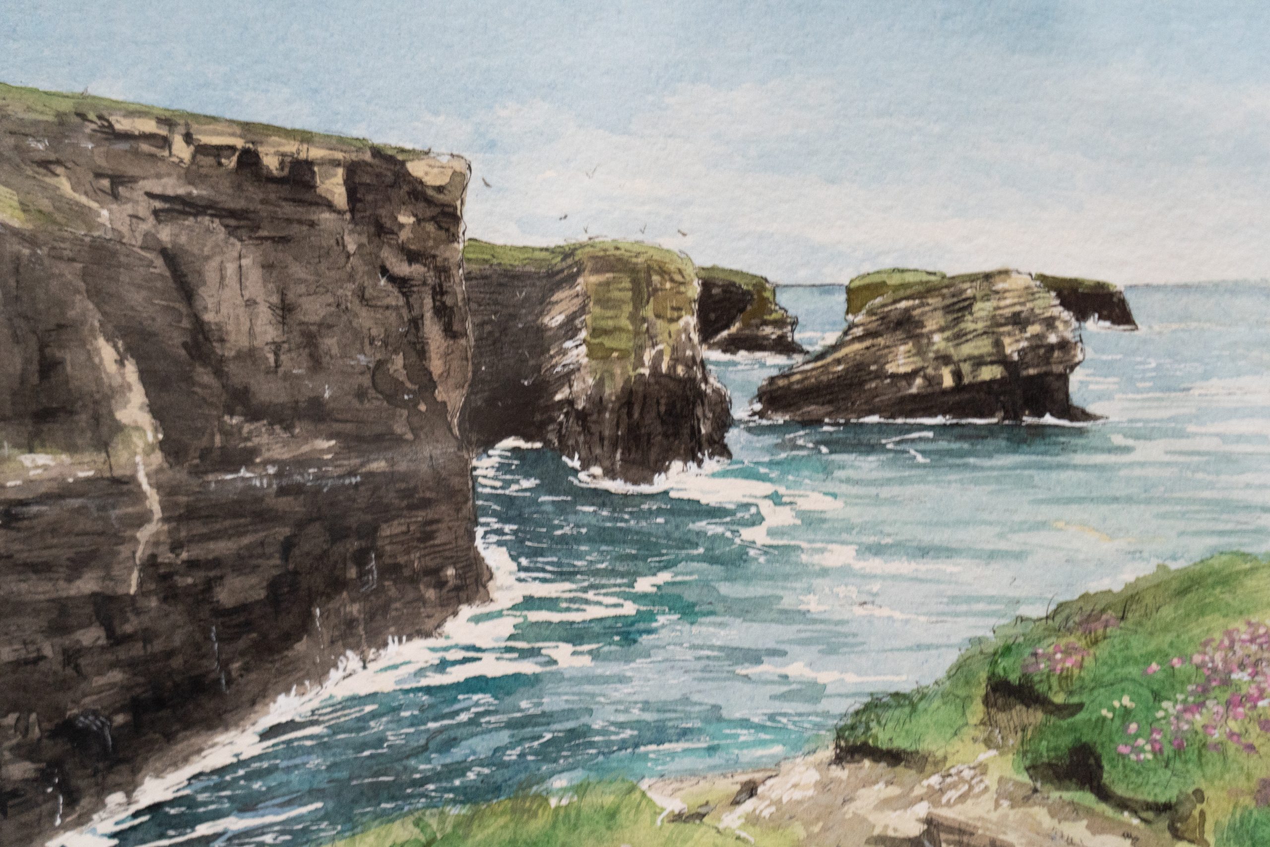 This is a beautiful and special moment along the famous Cliff Walk in the seaside town of Kilkee, captured in watercolours by the artist signing their work as ‘D’. The artist really captures the scale of the cliffs here.