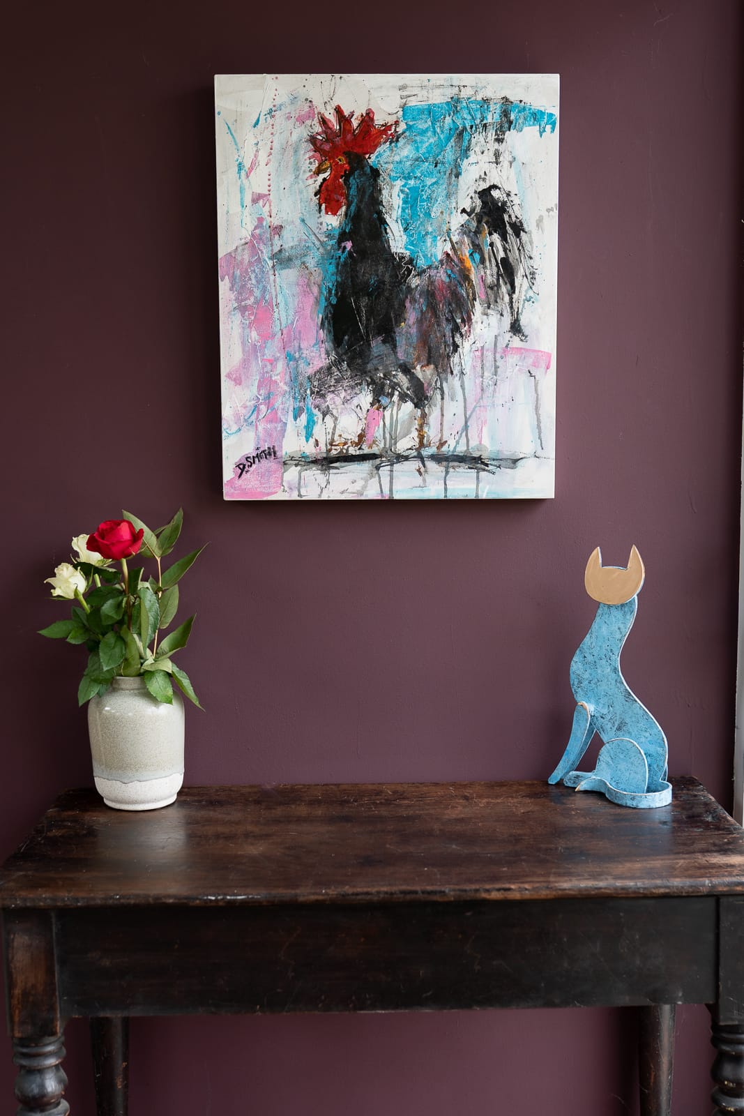 This ‘acrylic on board’ by Danny V Smith would make such a fun addition to any contemporary art collection. This piece, entitled ‘Cockerel’ is such a prime example of the untethered brush strokes of Smiths artworks. The gorgeous crazy use of colour and the paint running freely down the board gives the impression of urban freestyle street art and brings a funky and distinctly contemporary edge to any space.