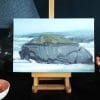 Originally a Kerry native, artist Kaye Maahs, has been living in the Burren, North Co. Clare for many years now – finding a constant stream of inspiration for her work at almost every turn. This latest edition of two oils on canvas were inspired by a stretch of coast road between Kilkee and Kilballyowen, Co. Clare, called the Dunlicky Drive, and a point there known as Foohagh. Two of the many sea stacks on that drive became her focus. Deliberate, visible brush strokes, which up close are almost not fully connected and seem soft, or even a bit difficult to define, but when standing from a distance, suddenly all fall together to produce the desired outcome and the magic happens. This kind of painting, a form of impressionism, is for lovers of fine art; relying on the viewer understanding what the artist has done – how they have managed to pull together light, shade and form in such a clever and seemingly subtle way, but one that from afar suddenly produces this amazing depiction.