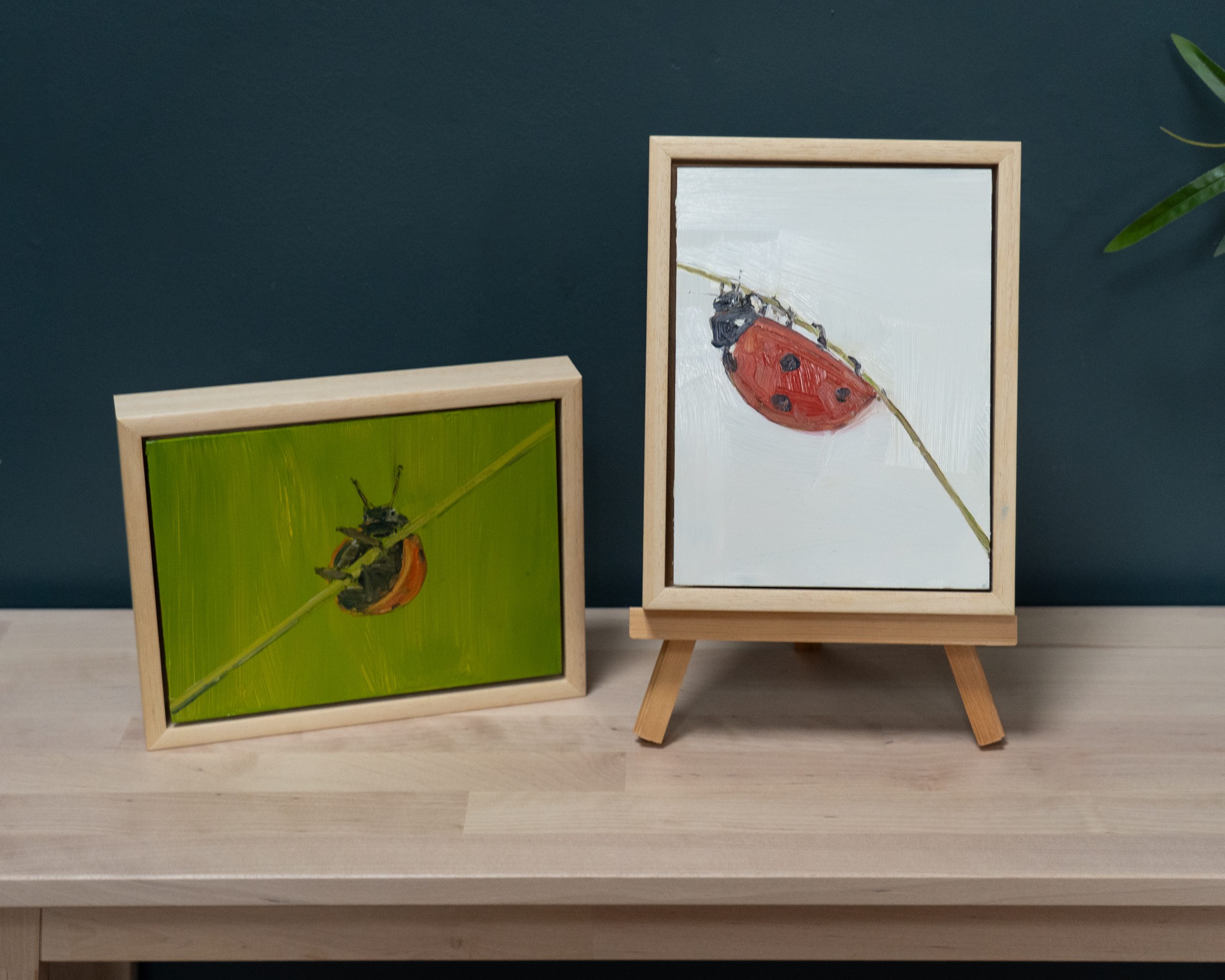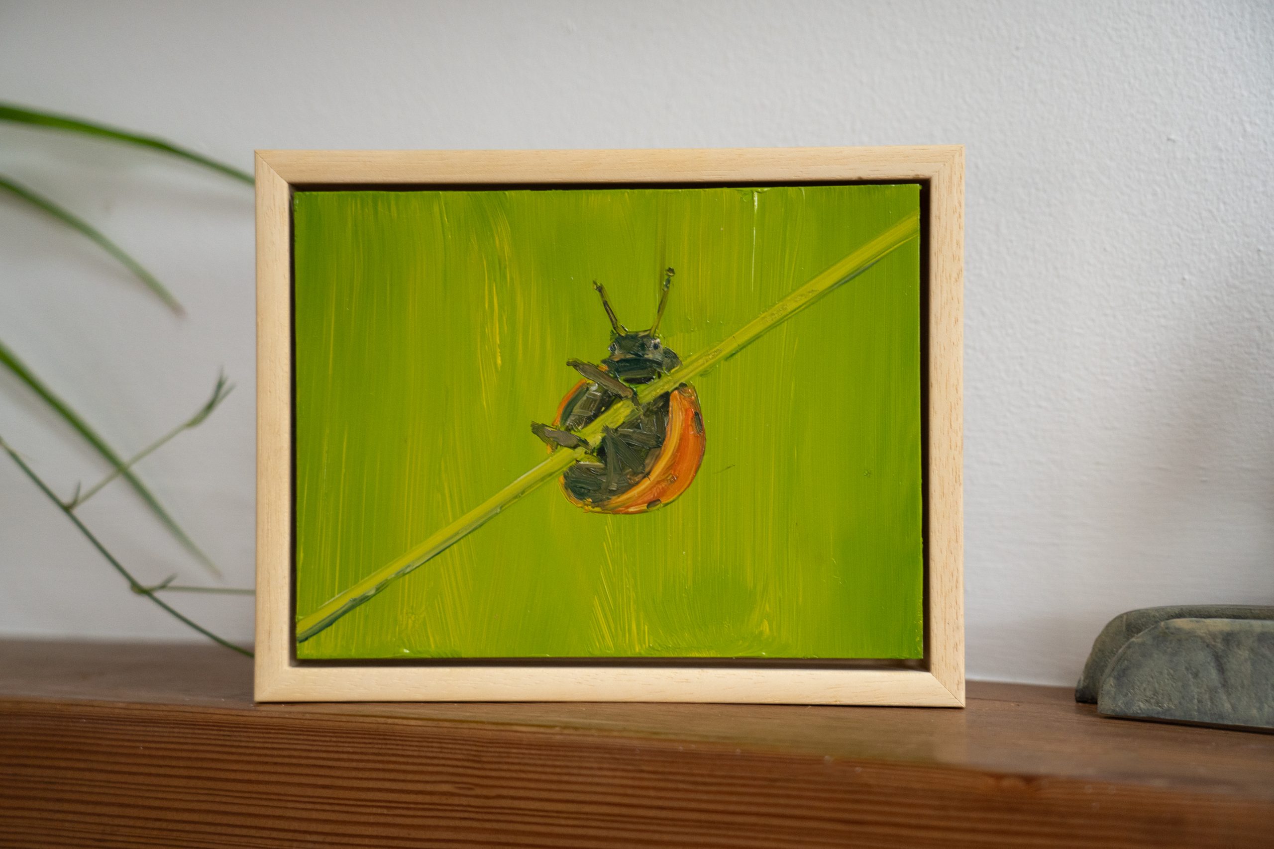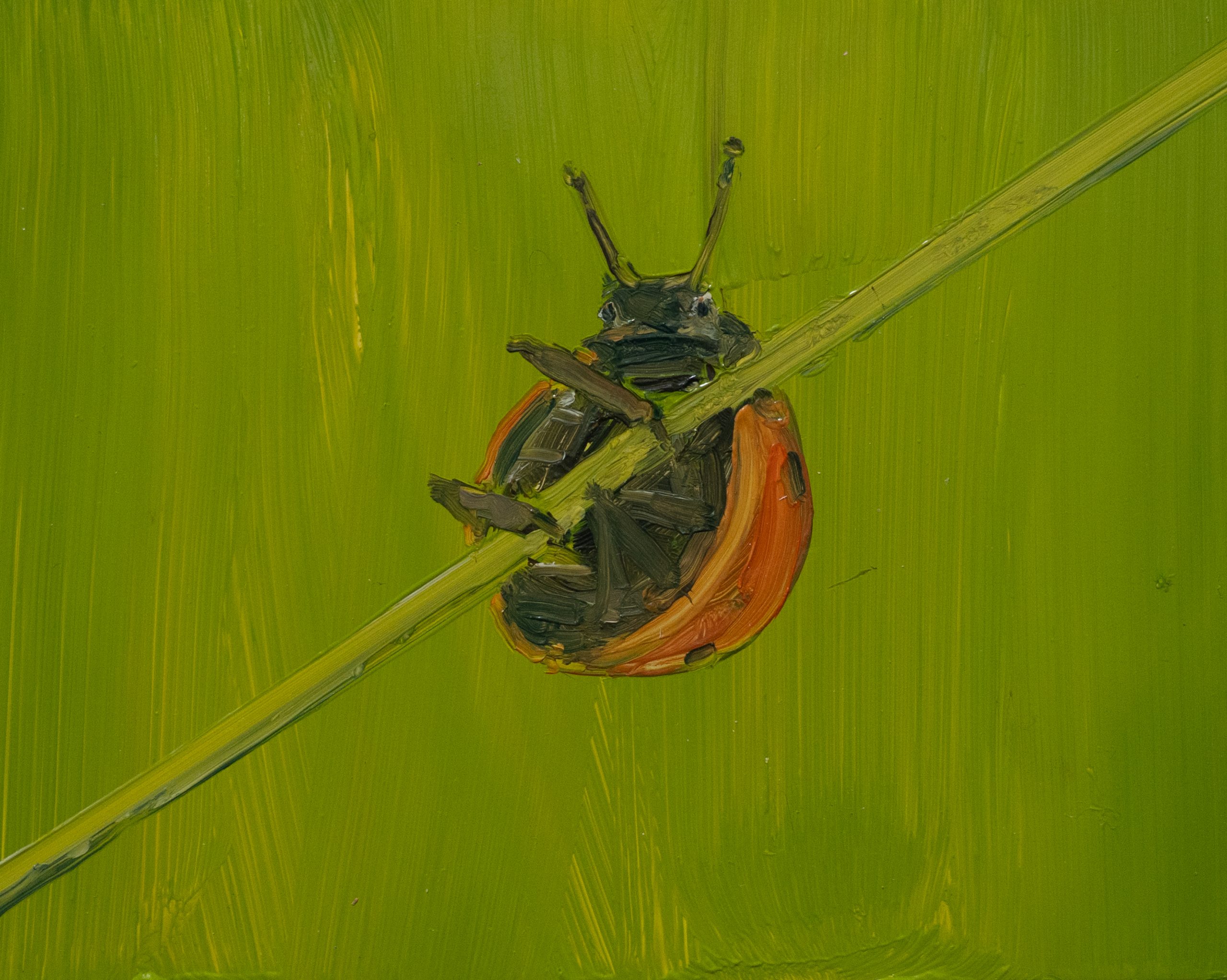 Everybody needs a fall guy!  Love this little ladybug on the grass so beautifully captured in oils by Kaye Maahs and against the most gorgeous, striking green background.