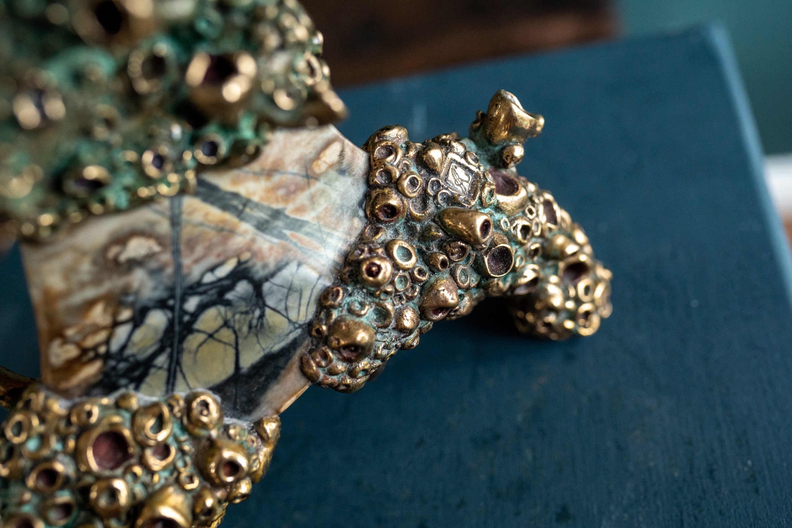 This is rather an extraordinary piece of sculpture by the Lithuanian born Arturas. The fine detail sculpting and casting work that would have gone into this piece is remarkable. Not only are the seahorses truly beautiful, but he has managed to create the most amazing tiny barnacles, and all fitted to this gorgeous slab of Picasso marble, to replicate a gorgeous golden reef.