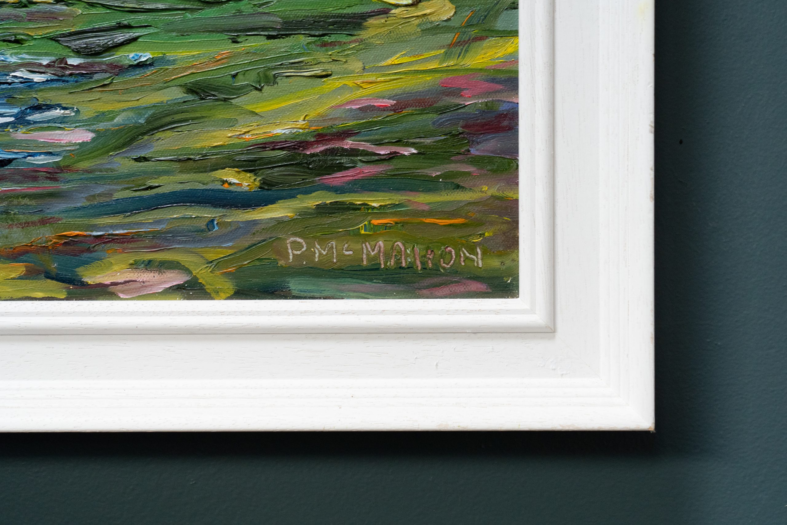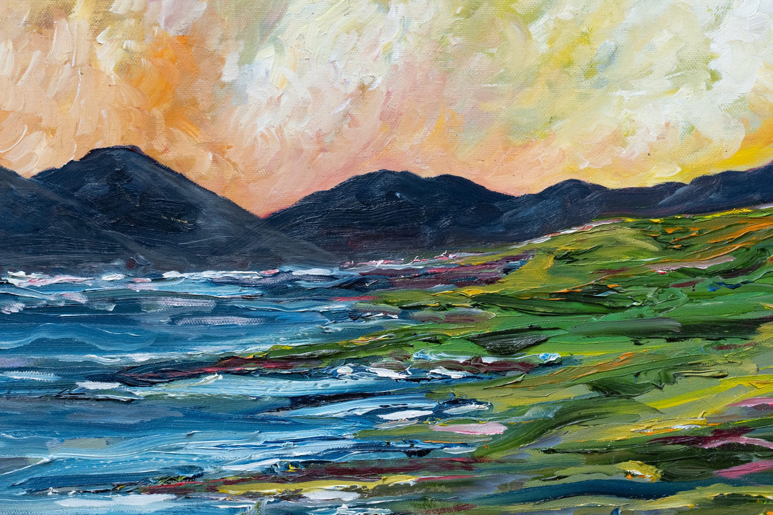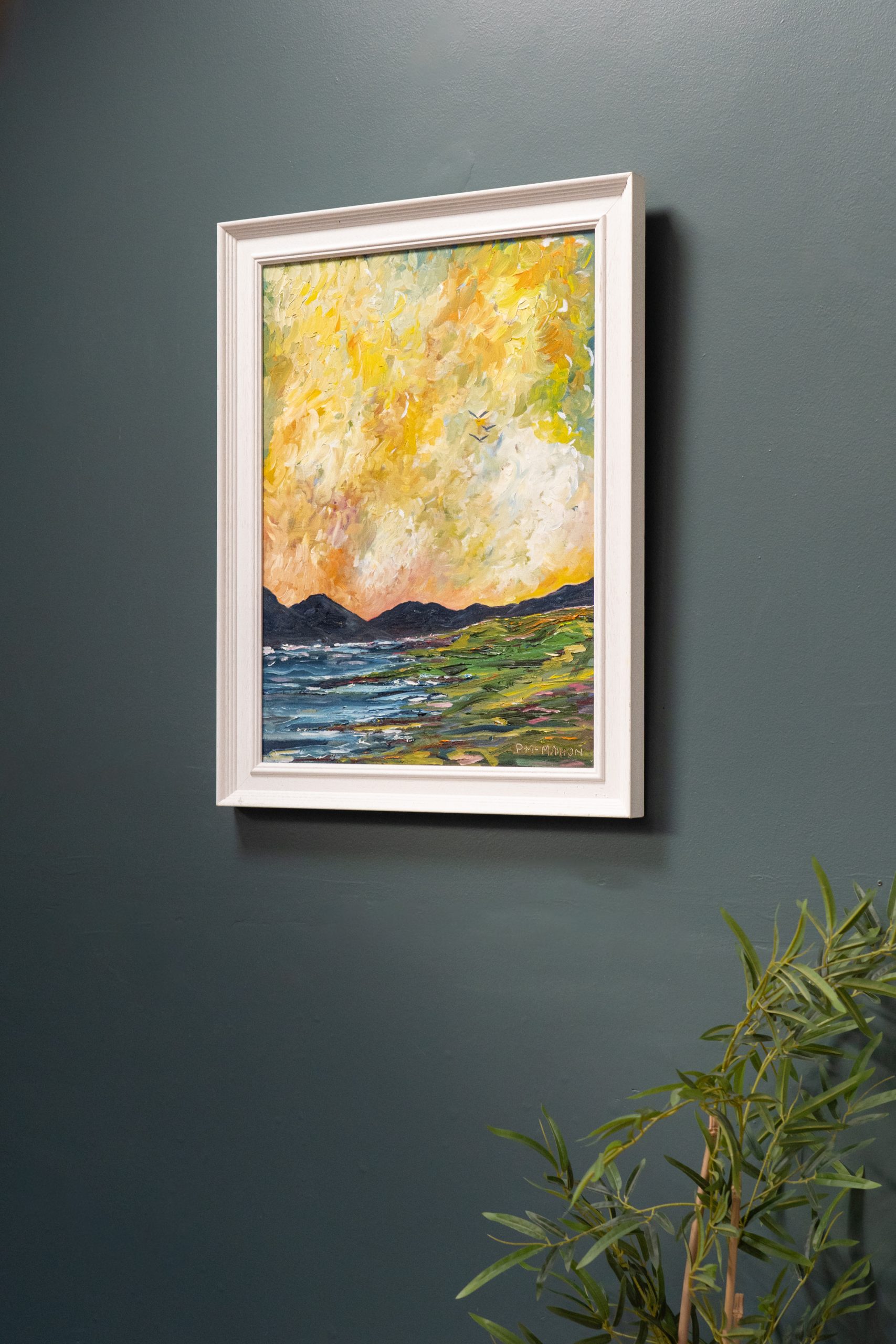 In this vivid and colourful painting, McMahon depicts in his own rather exciting, expressionistic style, a West of Ireland landscape and a beautiful golden sky.