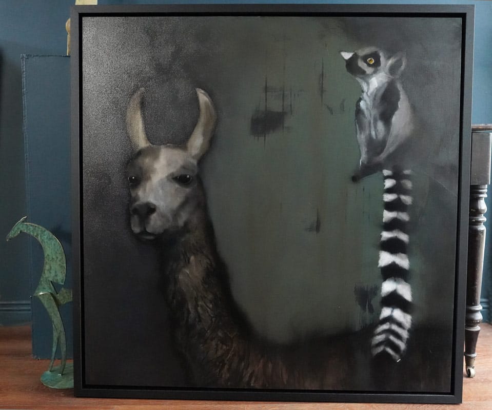 Superb in its eccentricity, this is a totally gorgeous acrylic on canvas (large at just over a meter square) of a Llama and a Lemur. Typical of Heidi in style and colouring, this gorgeous piece of original art will be a striking talking point in any home or public space. The total bizarreness of these two particular animals being thrust together in a piece of original art, is what makes this a truly special piece and it would not just fit in, but would stand out, for all the right reasons, in any impressive eclectic art collection.
