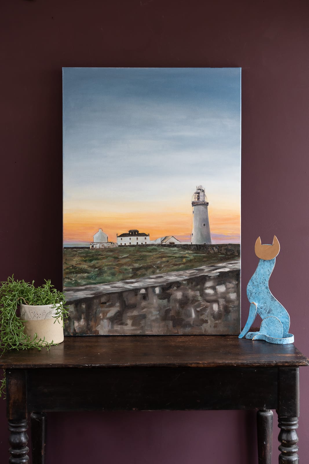 That special moment when you peer over the old stone wall at Loop Head Lighthouse, to witness the evening sun setting behind the beautiful old buildings. Painted in oils by the West Clare artist who signs their work only as ‘D’ – this is a large, unframed canvas, in portrait orientation, with beautiful, varying sky blues – melding into that gorgeous golden hour sunset – just before the darkness begins to set in.