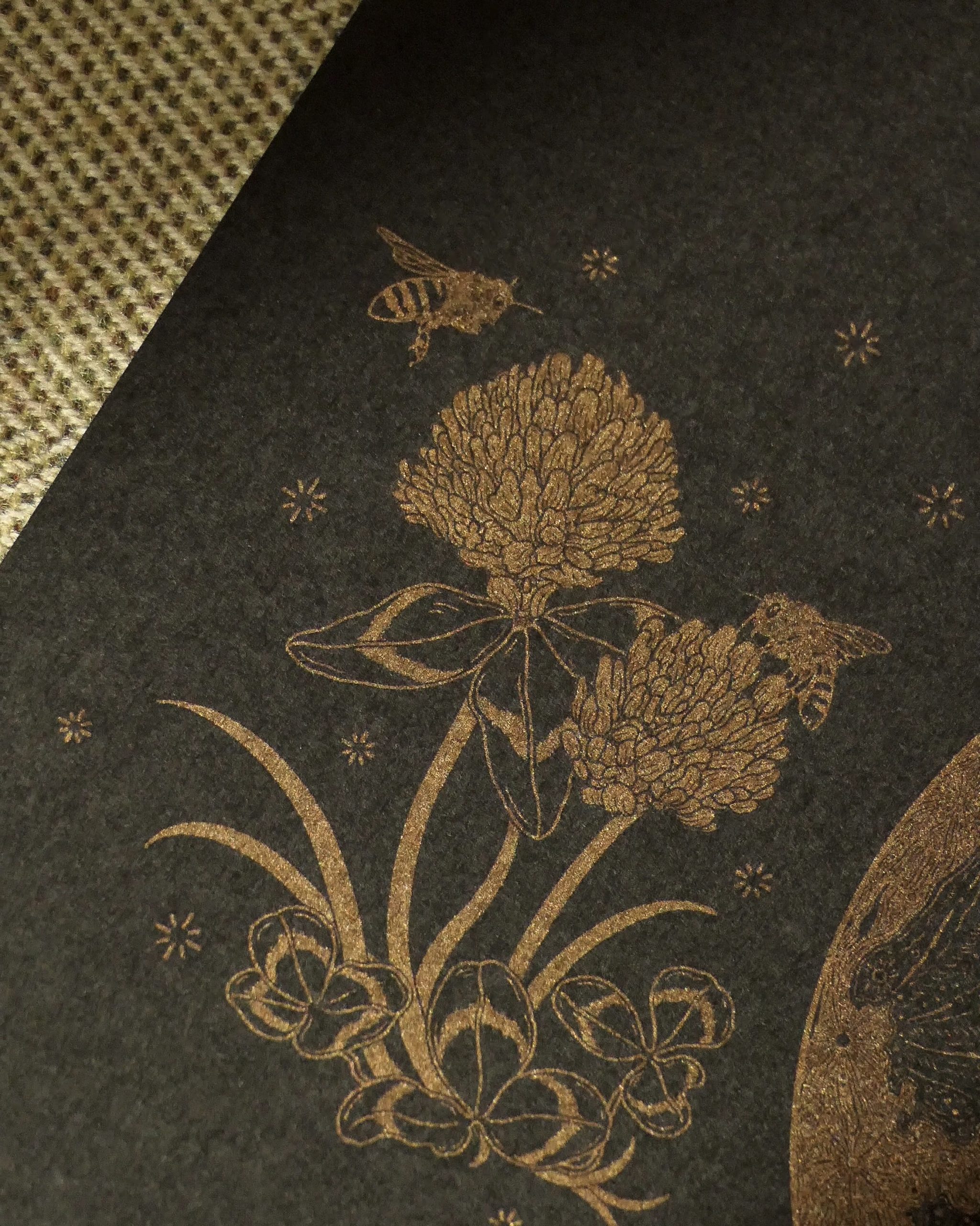 The artwork features a large central moon accented by native flora and fauna either side, these being honeybees which are dancing between clover and heather. Each print is illustrated and designed by Kerry Eugenie Prendiville, an Irish artist living on the rugged coast of Co. Clare.