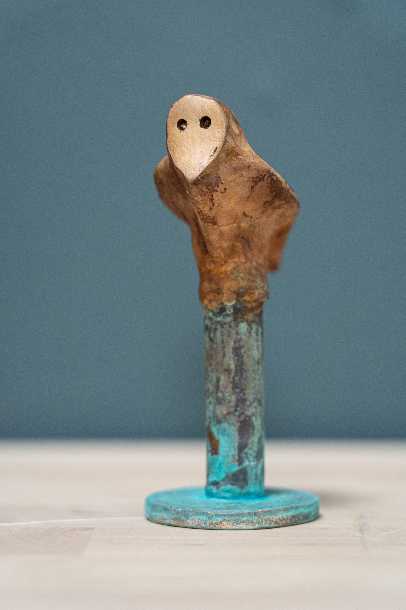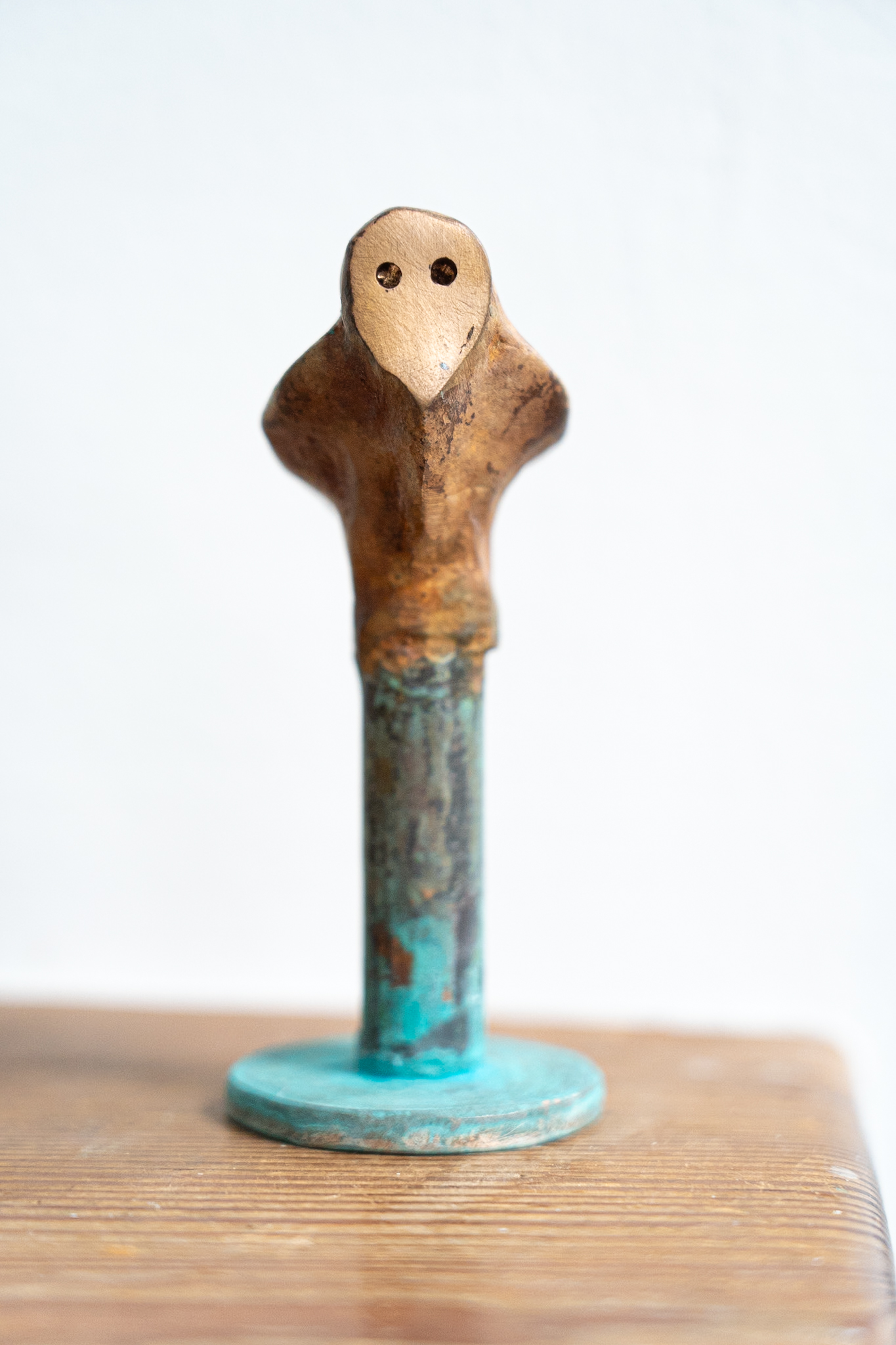 Beautifully patinated in a light brown, with his polished bronze face, this is only part of an edition of two miniature pieces by the sculptor. In the typical upright stance, this particular owl remains vigilant, head to one side, keeping a close eye on proceedings.