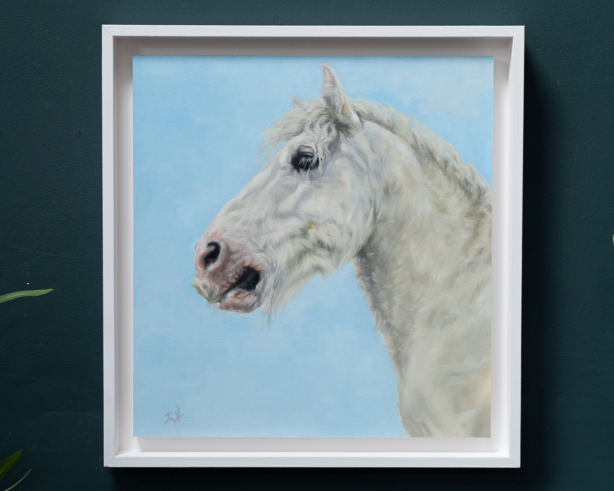 Inspired by her love of animals, this is a truly beautiful painting of ‘Napoleon The Irish Cob’ – at the hand of the extraordinarily talented contemporary artist Rebekah van Kan. New to the gallery, but not to the craft, Rebekah has an extensive and loyal client list and we are thrilled to have some of her striking pieces. Although these pieces are actually oil on a specially primed paper, they are fused to a board using archival techniques so that each piece is future proofed to behave rather like canvas.