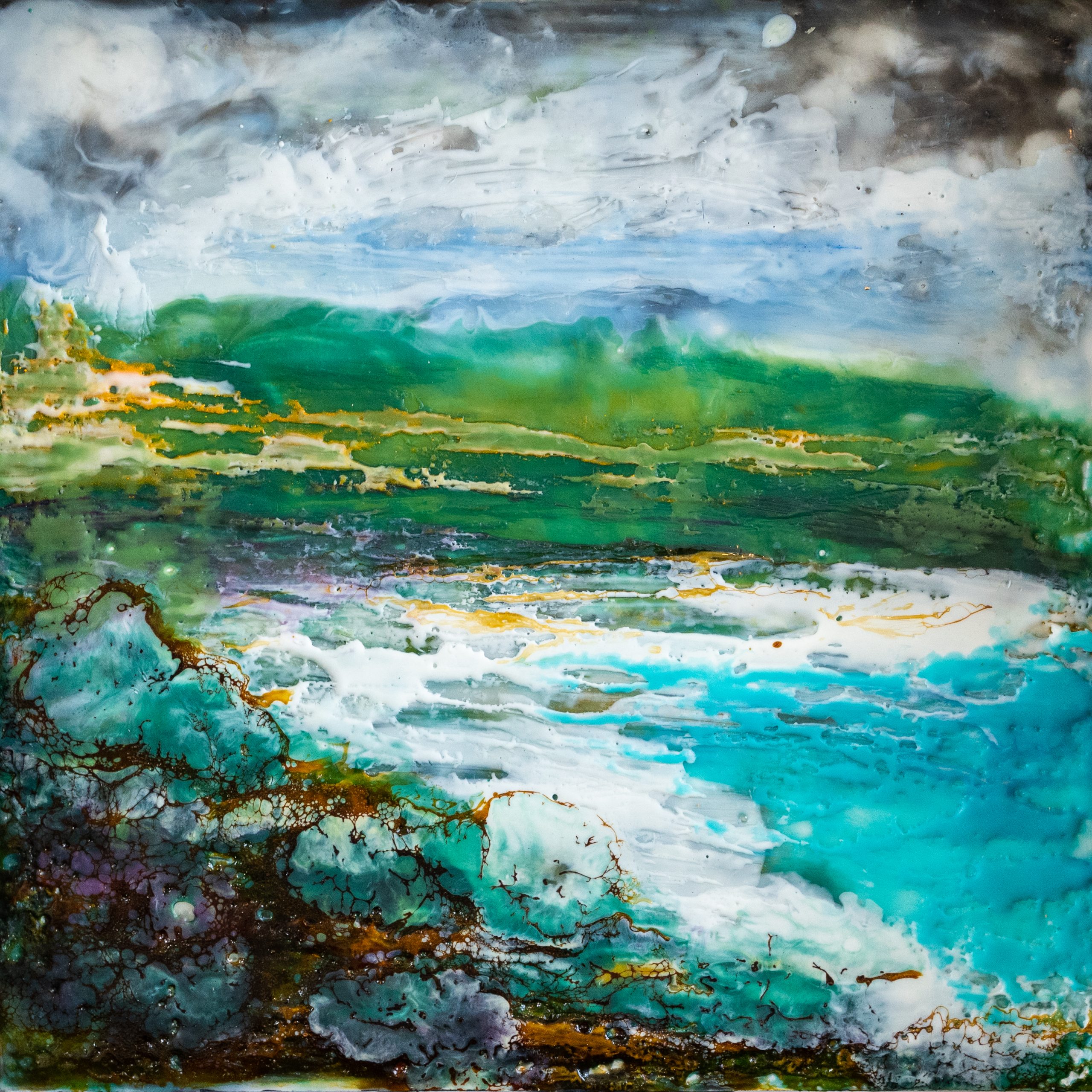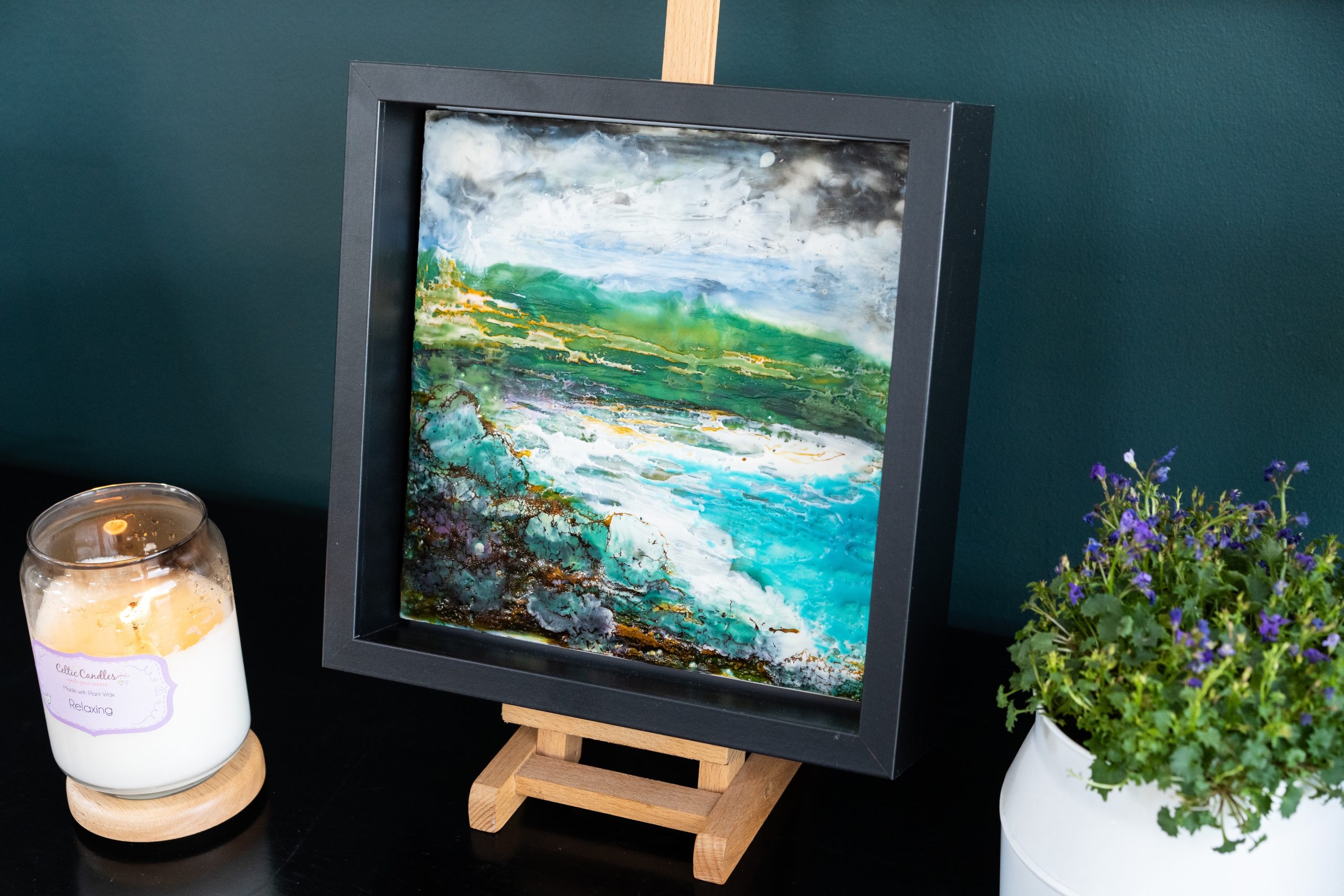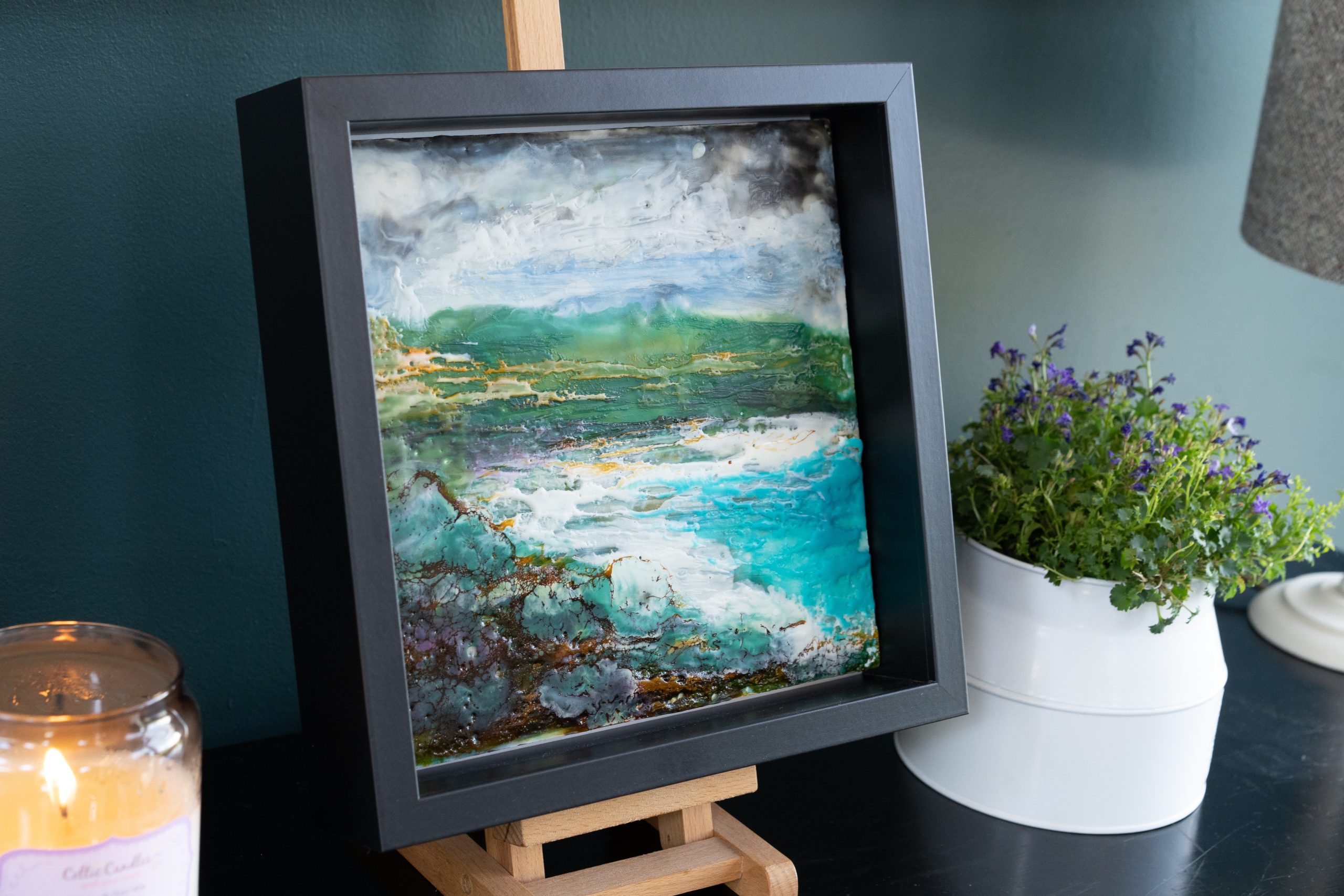 ‘Our Irish Shore’ is a beautiful and striking original work of encaustic art, using hot pigmented wax.