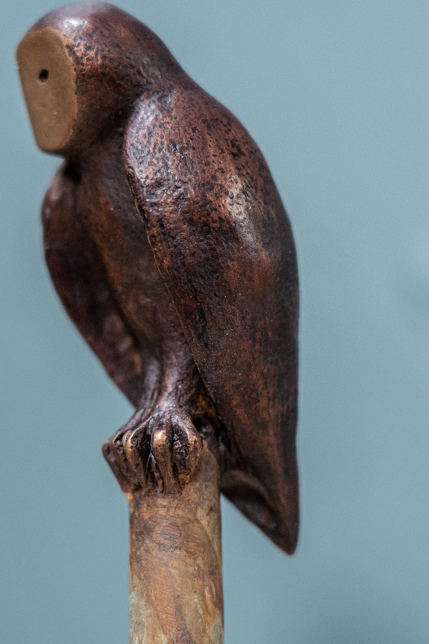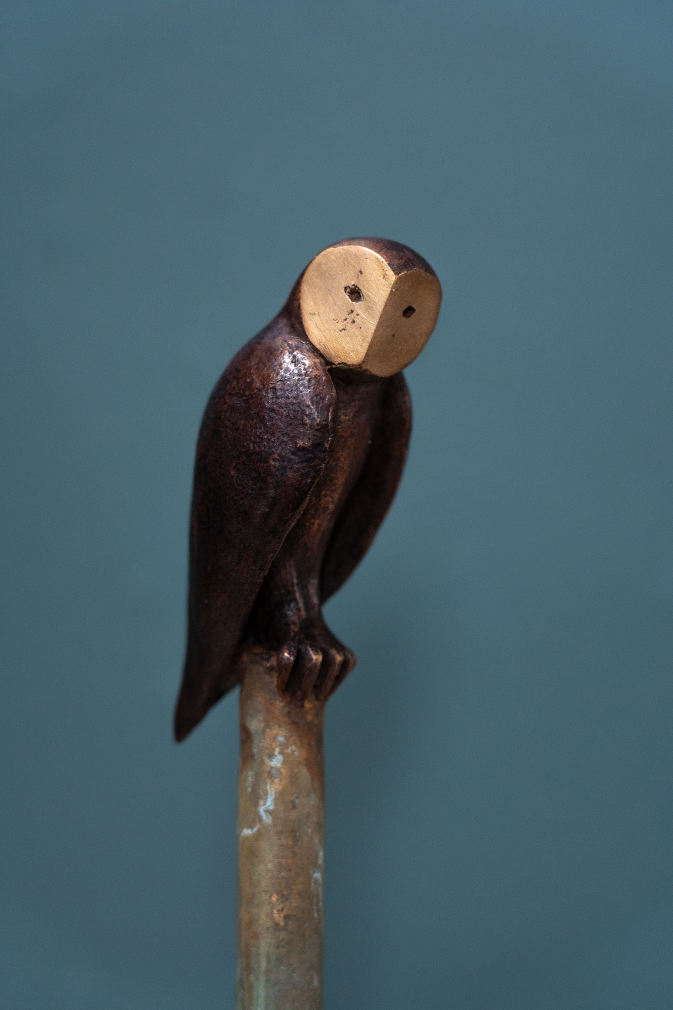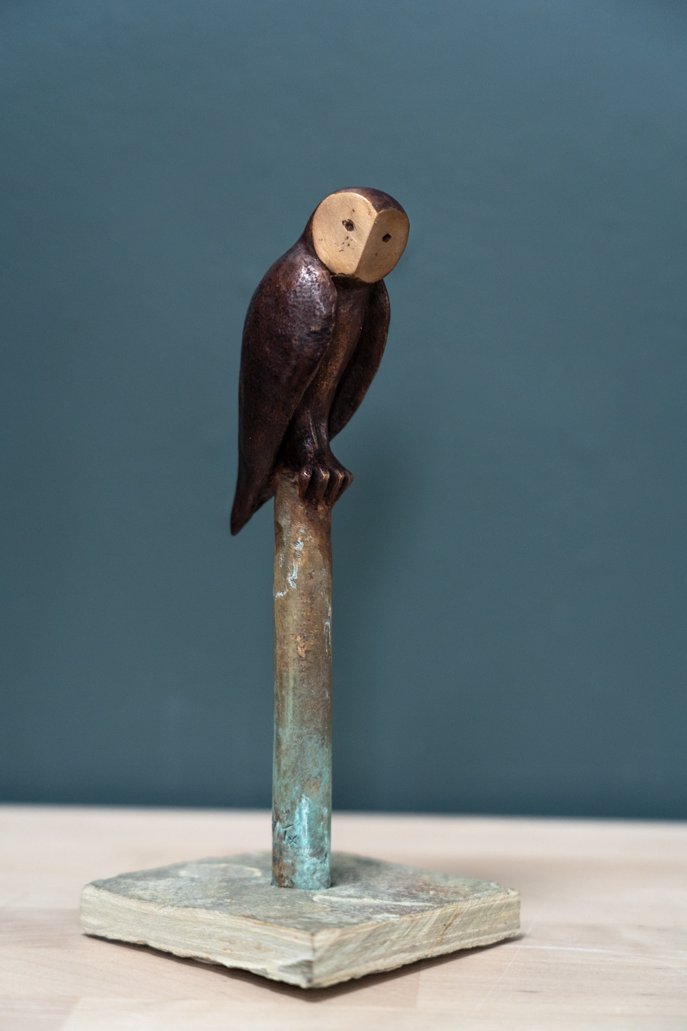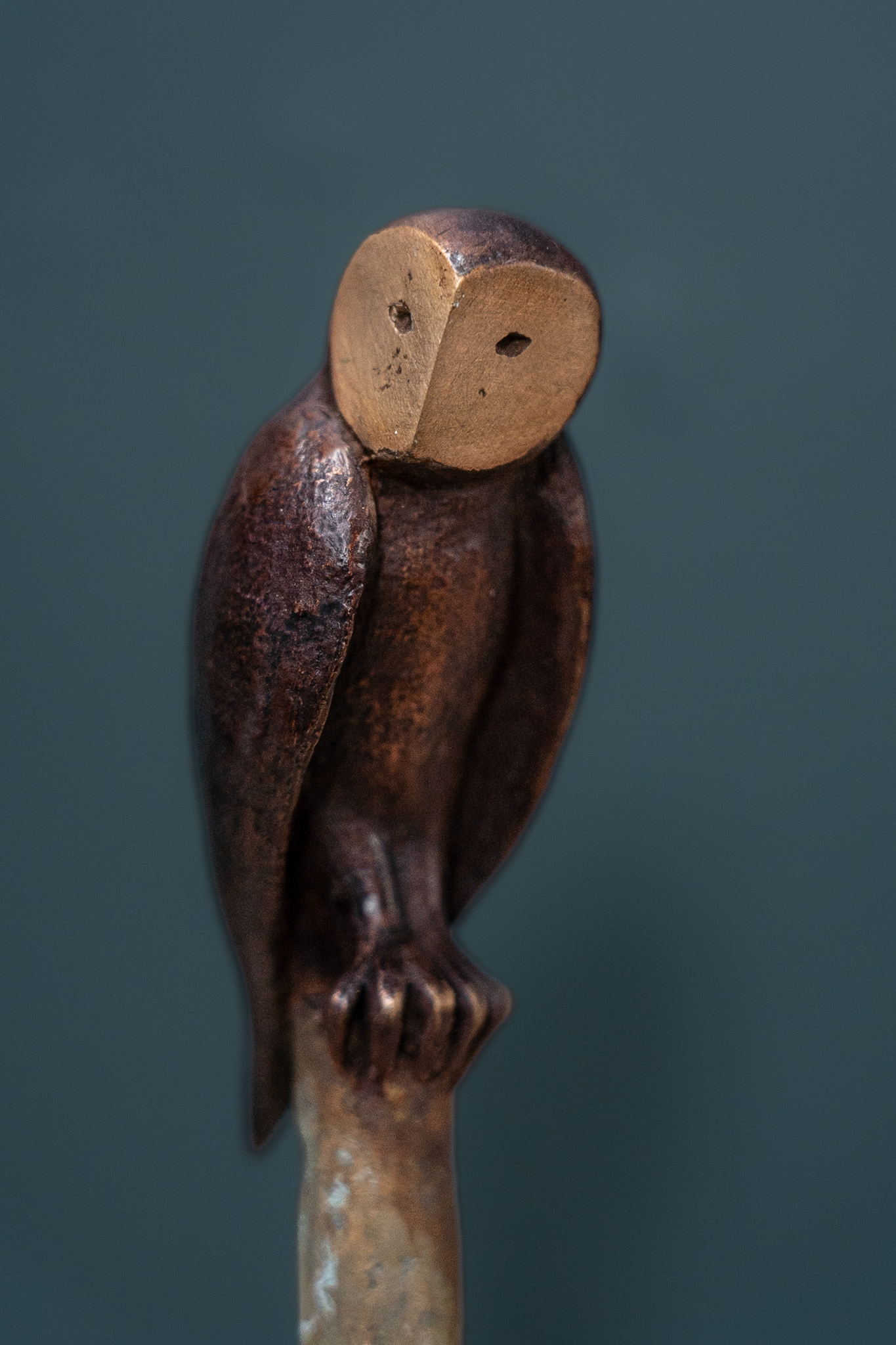 Beautifully patinated in a deep brown, with his polished bronze face, this is part of an edition (of nine pieces) by the sculptor. In the typical upright stance, this particular owl remains vigilant, head to one side, keeping a close eye on proceedings.