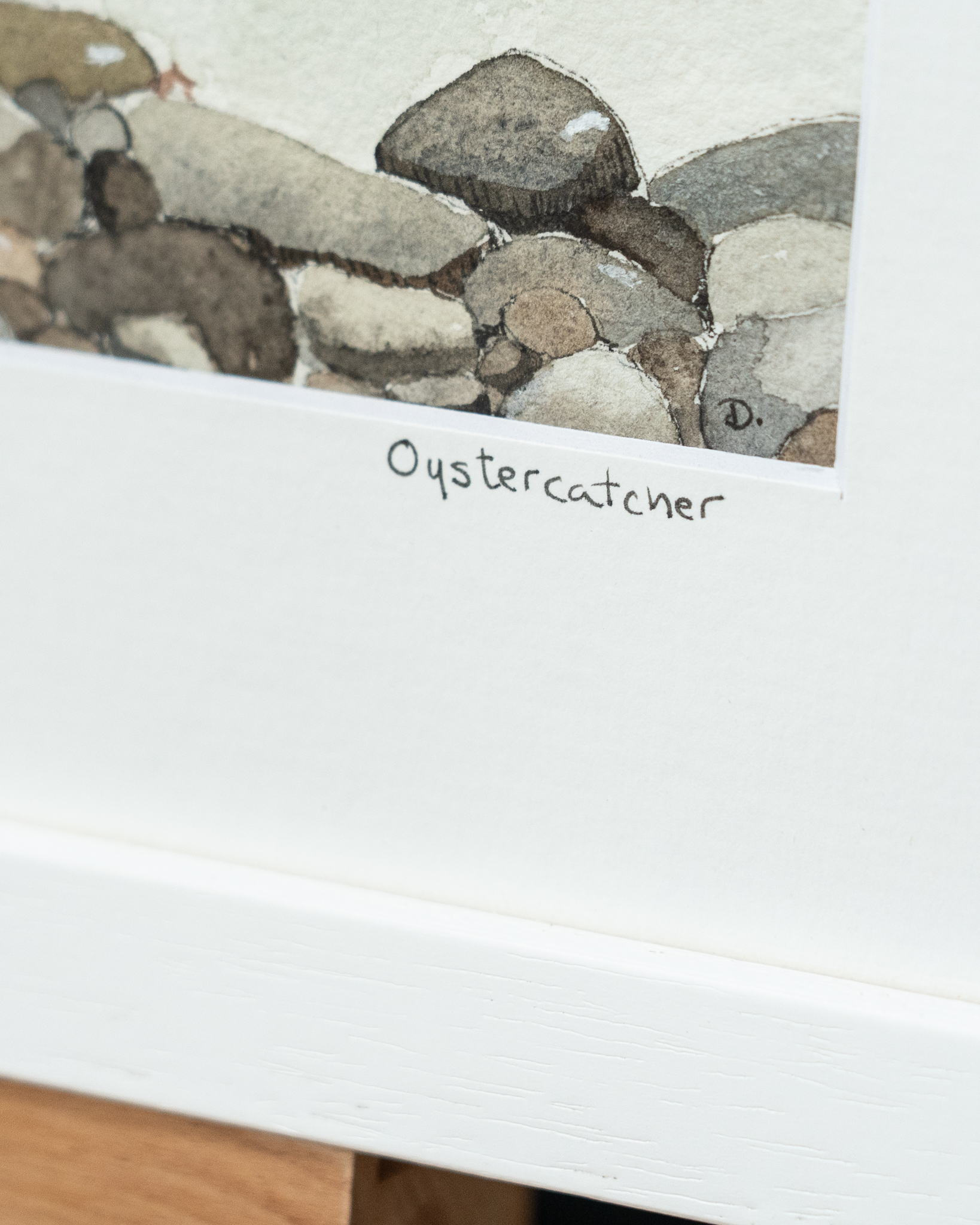 Beautiful original watercolour by the artist ‘D’; this is the very sweet, small shorebird, called the Common Ringed Plover, positioned here in the foreground of this painting, amidst a plethora of sea stones at the waters edge.