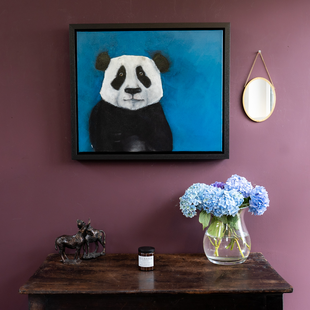 Beautiful, piercing eyes, painted against a contrasting background of bright blue. Heidi Wickham’s handling of this little guy is particularly contemporary and fun. With a soft charcoal outline and painted out in bold and strong acrylics, this Panda would be a definite talking point in any home.