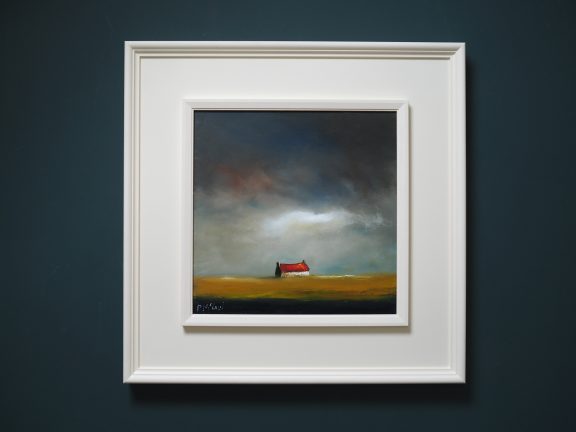 LOVE this gorgeous and atmospheric painting by Padraig McCaul. Beautifully entitled ‘Quietness’, you can actually feel the ‘stillness’ emanating gently from the canvas. The lone cottage on the hillside, with its bright red tin roof, beneath this vast, dark and moody sky, creates an immediate sensation of solitude and quiet. Beautiful simplistic subject matters, but painted with the most confident use of colour and brush strokes makes any work by Padraig, instantly evocative and appealing. Padraig’s colour palette coupled with the most beautiful cream frames, means that a McCaul piece is always incredibly striking against any wall.