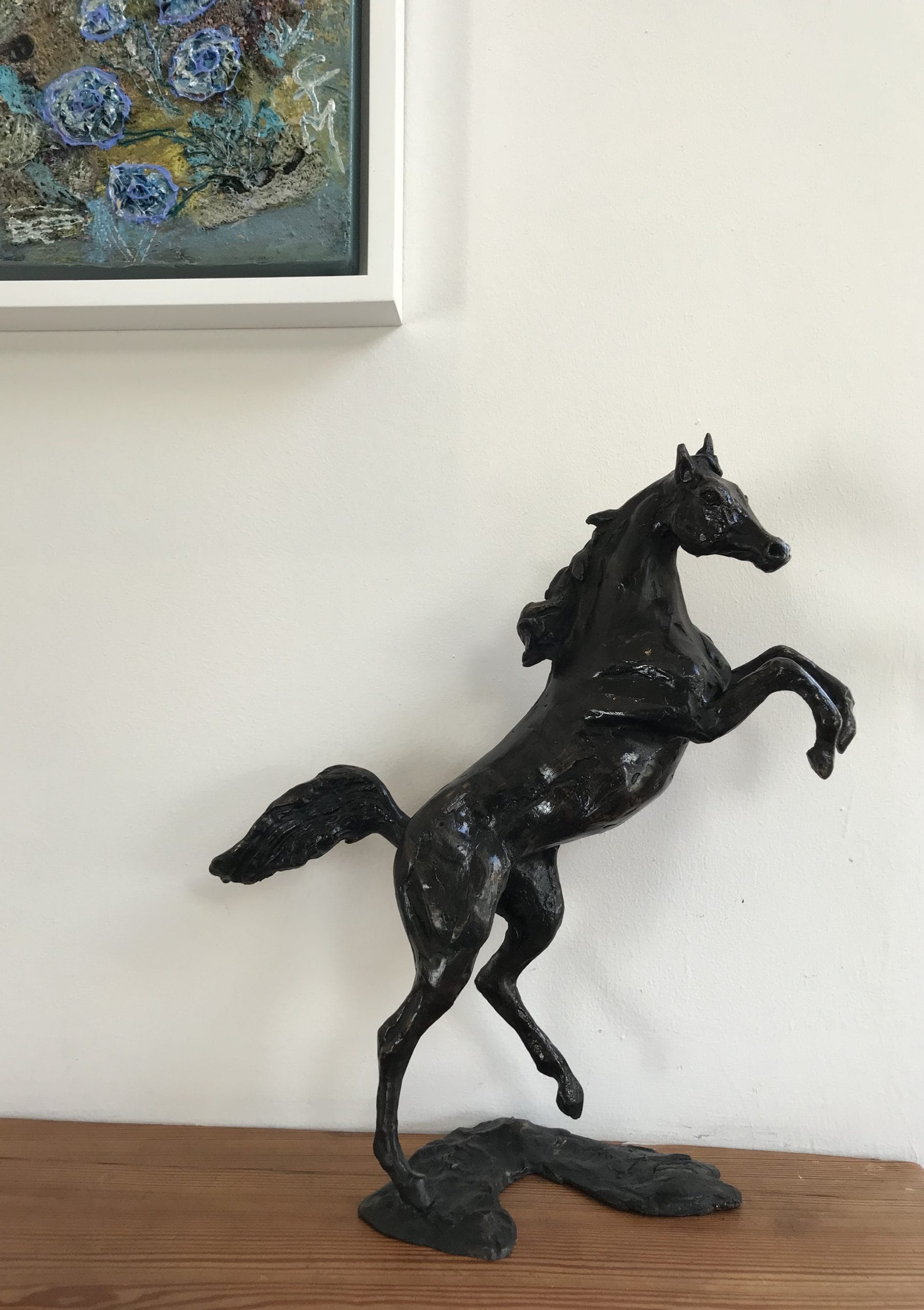 We were incredibly excited to have work by renowned sculptor, Siobhan Bulfin, here in the gallery. Siobhan is the sculptor responsible for some of the most beautiful and probably the most notably important lifesize and larger than lifesize horse sculptures in Ireland over the years. Here she has provided us with a beautifully sculpted, proportioned and cast bronze statue of a rearing Arabian Stallion, with incredible movement and anatomical perfection.