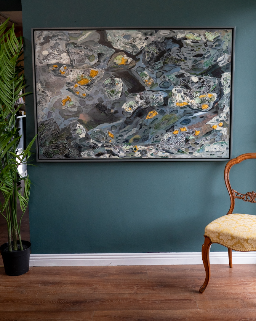 A very large piece at a metre and a half in width – one of her largest in fact – this utterly striking mixed media piece of art has so many surprises the closer you look; from the hidden surprises of the cracks and crevices and the inclusion of texture and such a specific colour palette, that brings that real sense of depth and of wonder. Carmel manages to bring in everything from the slippery surface, to the anemones, the algae, pebbles, sand and sea stones, and the yellow lichen. This amazing work would look incredible in a large contemporary home or public space. Superb.