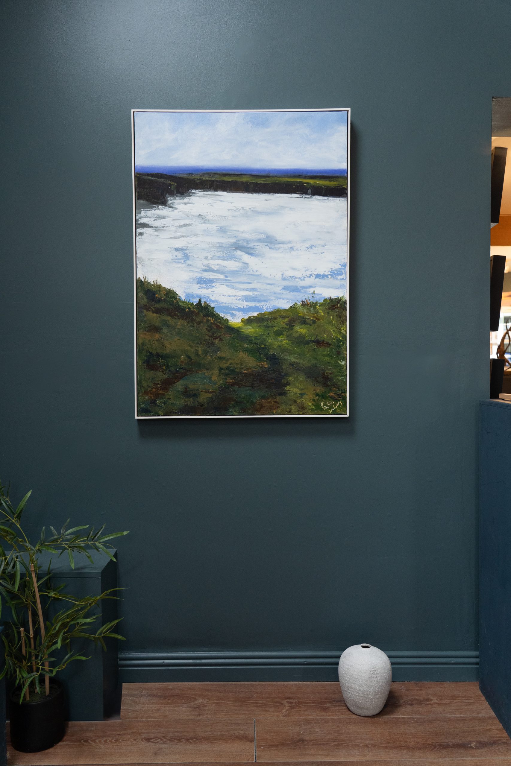 This striking original oil on canvas really captures the wildness and spirit of the ocean, and transports you to that vantage point high on the cliffs overlooking the view, This would look incredible in a beautiful big and airy contemporary space, providing a superb punch of colour and nature.