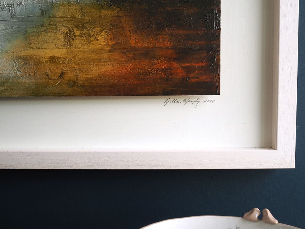 Another striking skyline by the inimitable Gillian Murphy. Everything comes together in a harmonic way, from the colours she chooses and how she melds them together in the most ethereal fashion. The end results are paintings into which you would just love to stroll and reflect. The colours here are warm and inviting.