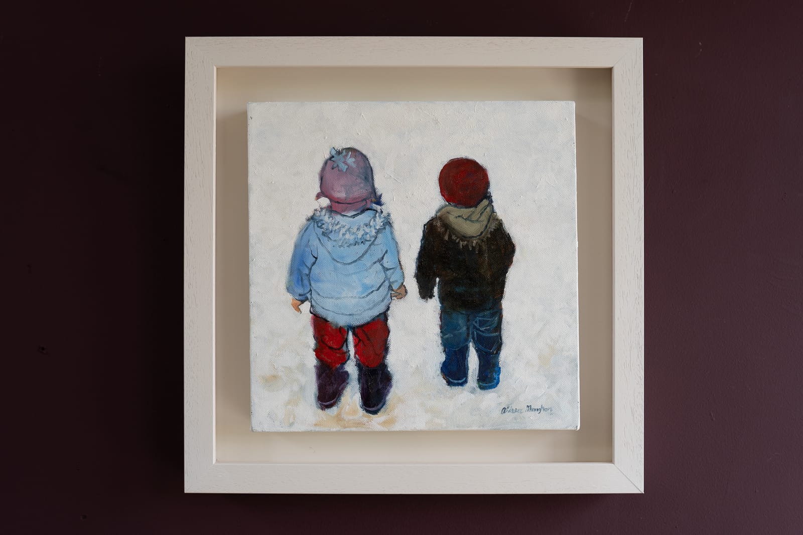 Somewhat reminiscent of the gorgeous illustrations of treasured childhood books, ‘Siblings’ is a beautiful moment, captured in delicate oils, of a sister and brother, on a walk in the country.
