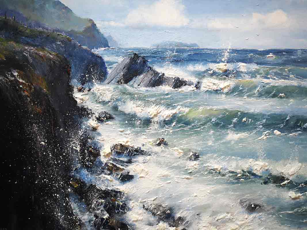 You can almost feel and even hear the vigour of the ocean in this magnificent painting of the famous rock formation off Clogher Head in Co. Kerry, known locally as The Sleeping Giant. It is a superbly executed painting, technically, but then Marks always are. His fascination with the wildness of our West Coast and indeed his choice to live by it and immerse himself in its surroundings makes for some incredible depictions. His command of oils is undeniably impressive; this combined with his use of light throughout, puts you right there, on the cliff edge, breathing in that salty breeze.