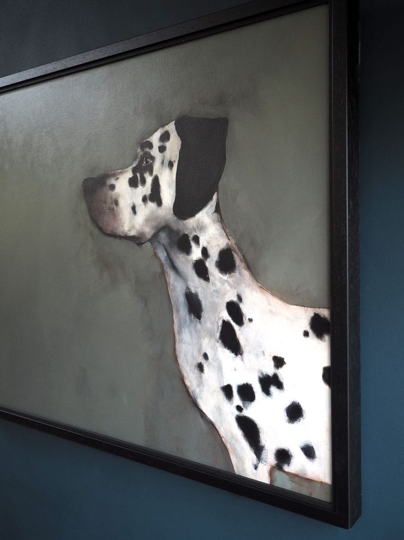 Heidi Wickham’s fondness for animals is once again evident in this truly striking Dalmatian Painting. At a metre wide and with superb use of colour, this piece makes quite the impact when hanging in a room; with your eyes being instantly drawn towards it. Dog lovers will appreciate the rather serious, expectant gaze of this particular Dalmatian; clearly, something rather important is happening in his all-encompassing, doggy world at that precise moment. Wickham draws her subjects in charcoal before painting them out with pastels and acrylics – and achieving a perfect colour balance throughout.