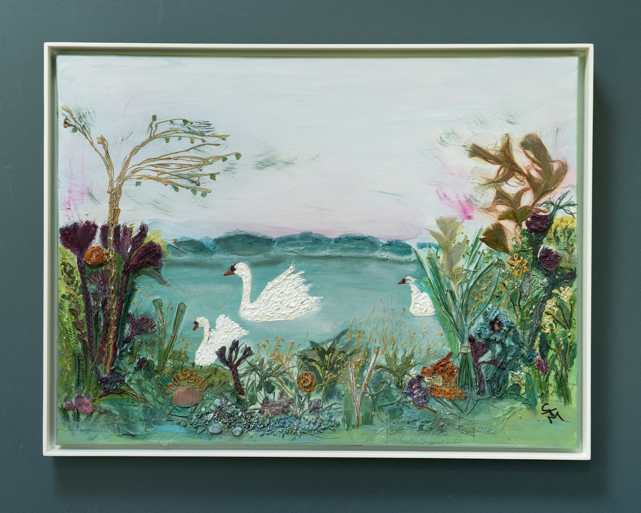 ‘Swans at Ballyalla Lake II’ is a striking and beautiful original piece full of colour and life – and would look beautiful in a bright contemporary space.