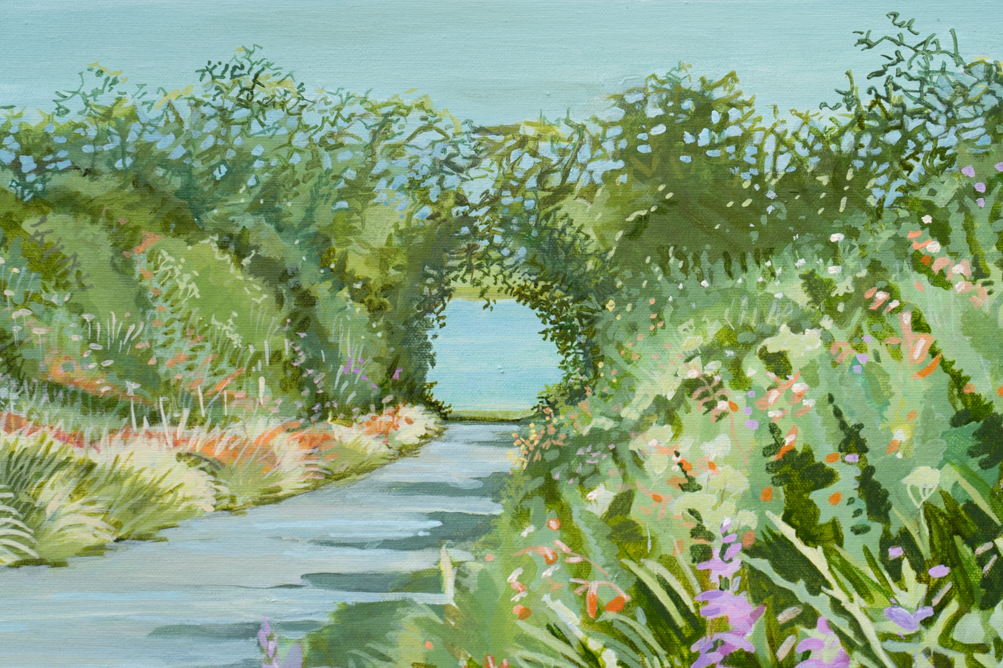 A beautiful summers evening in West Clare. This painting, skilfully depicts a sun-drenched stretch of road in rural Querrin, on the Loop Head Peninsula, where the montbretia and the purple loosestrife herald the way, lining the ditches and bobbing gently in the breeze; with the Shannon as its backdrop. You can sense the warmth, the gentleness and the silence from this painting. A large piece at 41″ in width, this piece makes such a gorgeous visual impact on the wall – as well as being the perfect excuse to stop in front of it, take in the beauty – and take a breath.