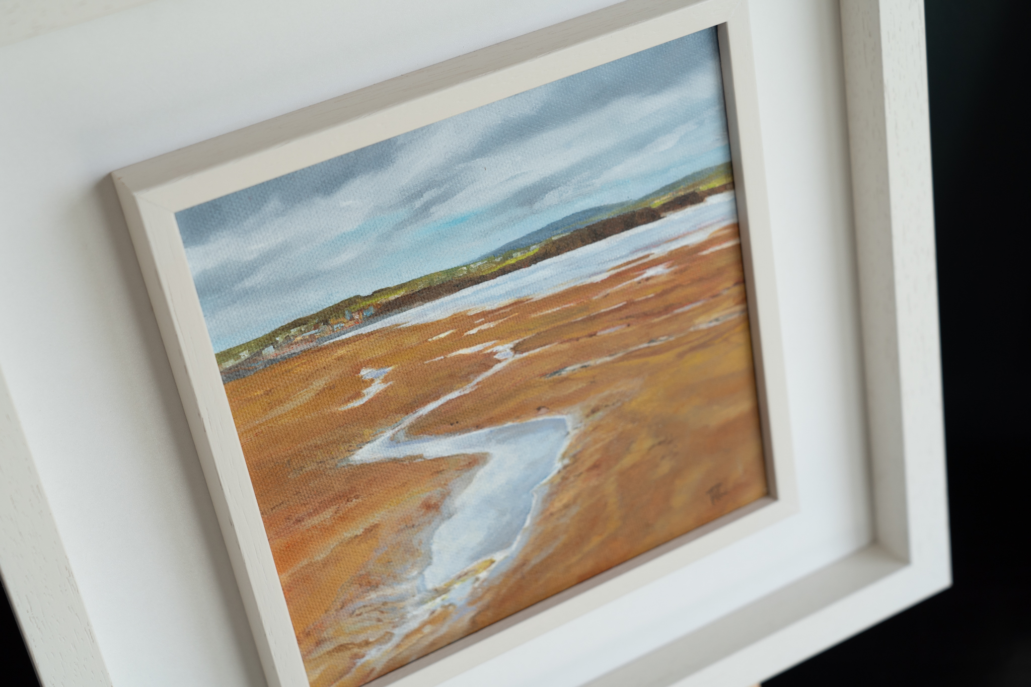 One of the most amazing features of walking the beach at Lahinch, is when the tide is all the way out, as far as it can go, and you are left with the most amazing landscape, chequered with glistening pools of seawater, tiny rivers in the sand, and what feels like a pathway, leading you out to meet the sea. Artist Mary Roberts has captured this walk across a series of four small oil paintings.