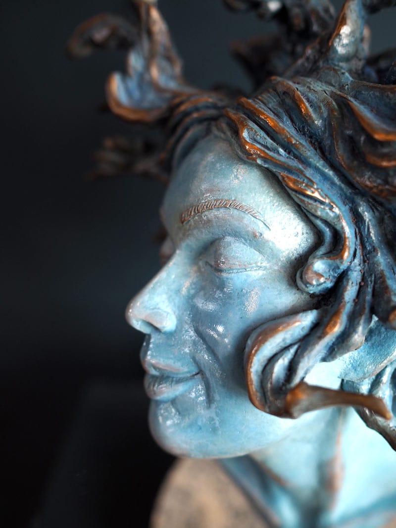 Another totally arresting sculpture by the artist Adil Vezir. Sculpted and cast here in Clare, this truly mesmerizing piece is of a windswept beauty; a lady strongly connected with the sea, the Atlantic, the Coast; her teal blue patina is strikingly strong, has amazing depth and is expertly applied. Adil’s eye for detail and structure is evident, as this particular piece looks slightly different from every angle and also is placed on a marble base in such a way as though it appears to be almost floating. This is the kind of sculpture that would stand proudly on a plinth or console table in any grand entrance or foyer. This piece is all about the drama and is sure to get everyone talking!